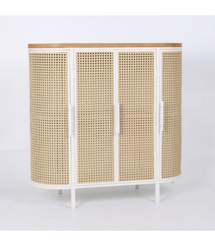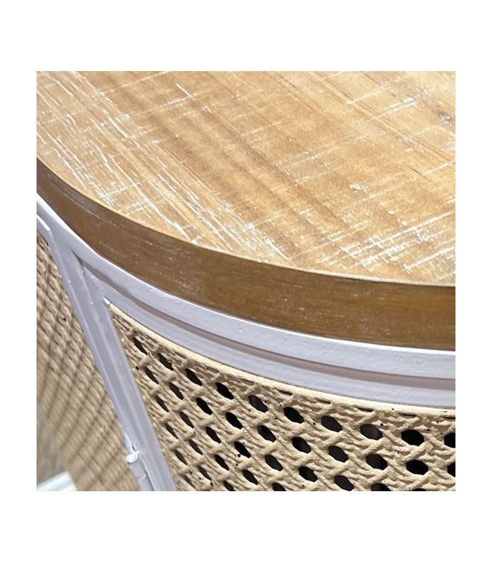 El Mueble Auxiliar Say tiene un diseño exclusivo, con forma ovalada de inspiración vintage. Está fabricado con estructura metálica, en color blanco. Los frentes están enrejillados en color madera natural. La tapa está fabricada en MDF en acabado madera rústica. Se sirve montada, por lo que no precisa de montaje.