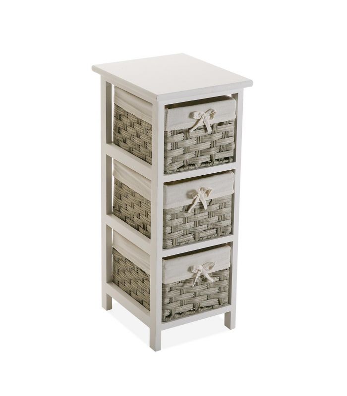 Cajonera de 3 Cestas, fabricada en madera color Blanco. Combina las cestas de mimbre, con bolsitas textiles en color beige. El detalle de lazo en cada una de sus cestas le aportan un toque muy original. Por sus medidas, es ideal para espacios pequeños. Es un mueble organizador con el que mantener el orden del baño, será realmente sencillo.