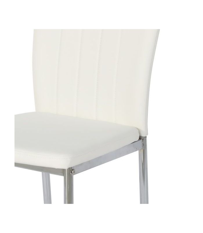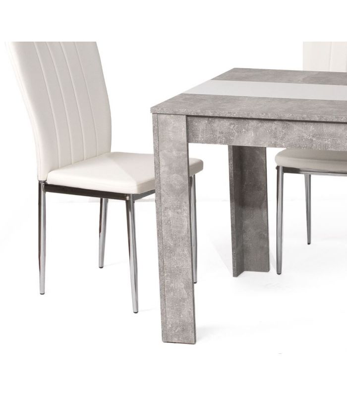 Conjunto de mesa y sillas fabricado con materiales de alta calidad, las sillas están tapizadas en similpiel blanca, el respaldo tiene costuras en vertical, para darle un toque diferente, además la sentada es cómoda para pasar un rato agradable y sus patas son cromadas metálicas. La mesa está fabricada en laminado sintético acabado cemento, con una franja central en blanco, sus patas son fuertes y robustas.