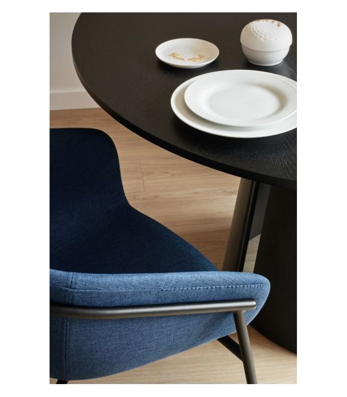 La colección Hug se caracteriza por cómo la estructura metálica abraza el cuerpo tapizado. Su asiento es amplio y confortable haciéndola perfecta para alargar las sobremesas o las cenas con amigos.