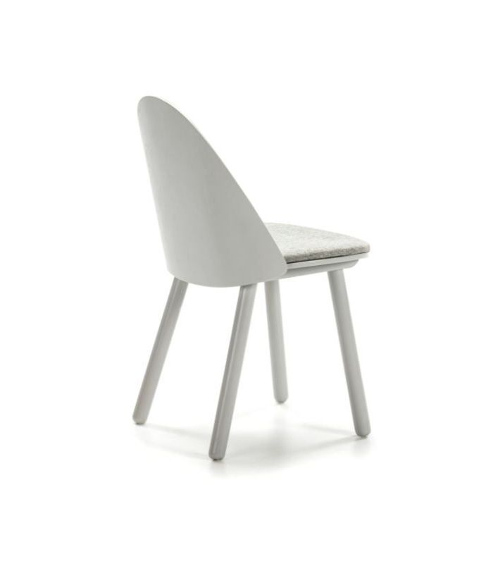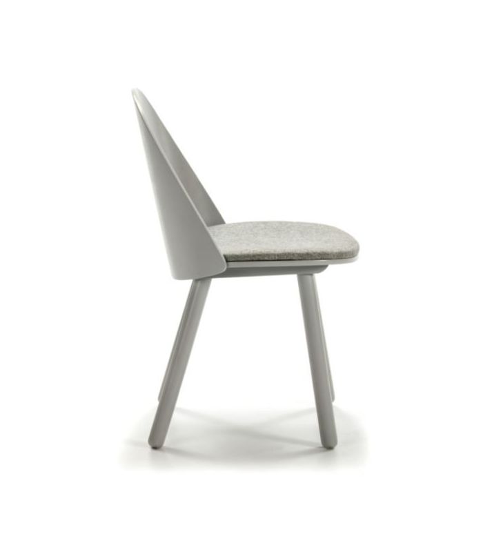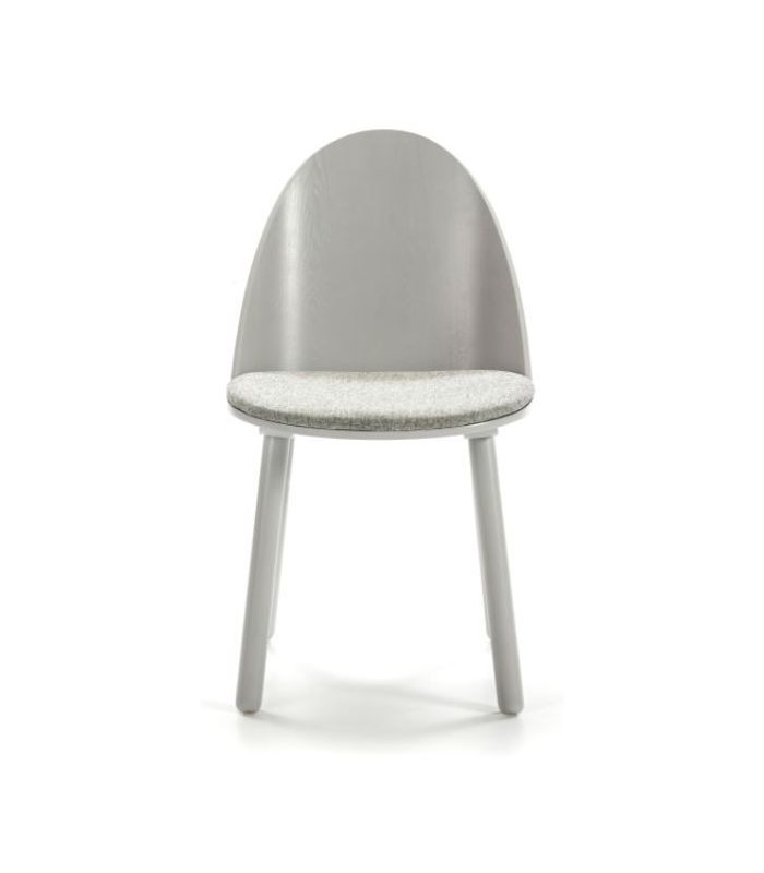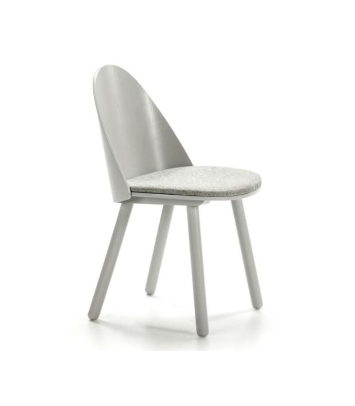 Silla de comedor Uma,  está fabricada en madera con acabado en color gris claro y consta de cojín tapizado en tela. Destaca por la sutil combinación de líneas curvas y rectas y la búsqueda de sencillez y ligereza visual sin renunciar a la confortabilidad. Está disponible en varios colores.