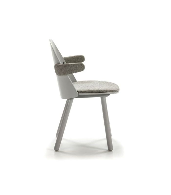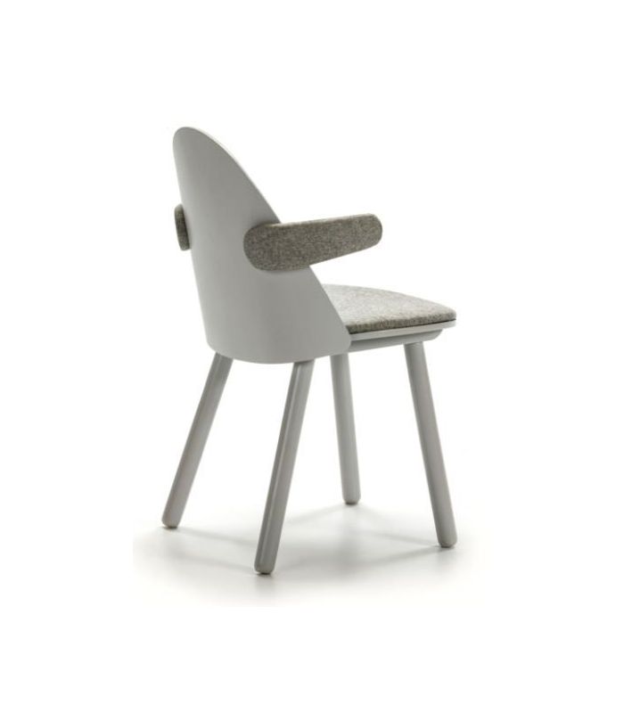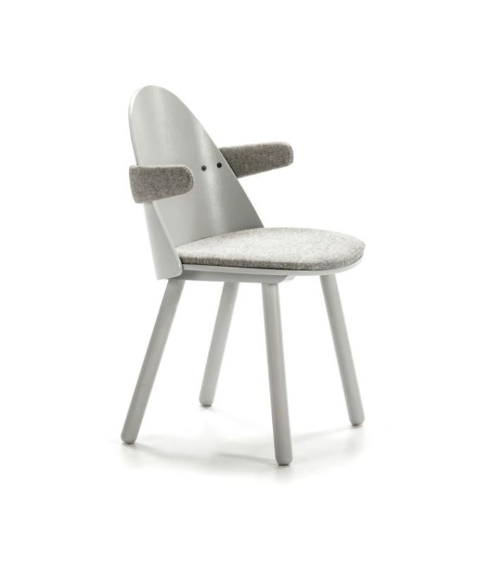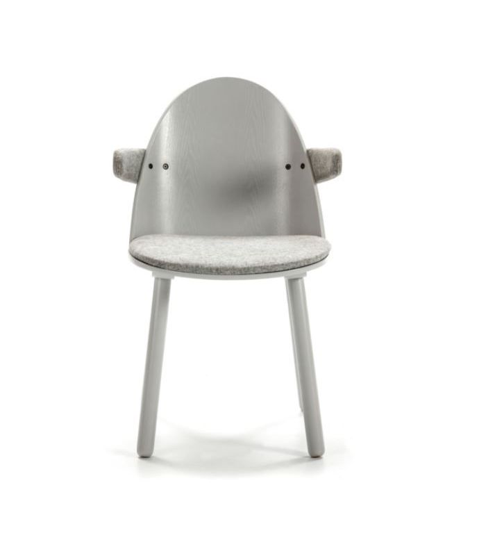 Silla de comedor Uma, destaca por la sutil combinación de líneas curvas y rectas y la búsqueda de sencillez y ligereza visual sin renunciar a la confortabilidad. Está fabricada en madera con acabado en color gris claro y consta de cojín y brazos tapizados en tela. Está disponible en varios colores.