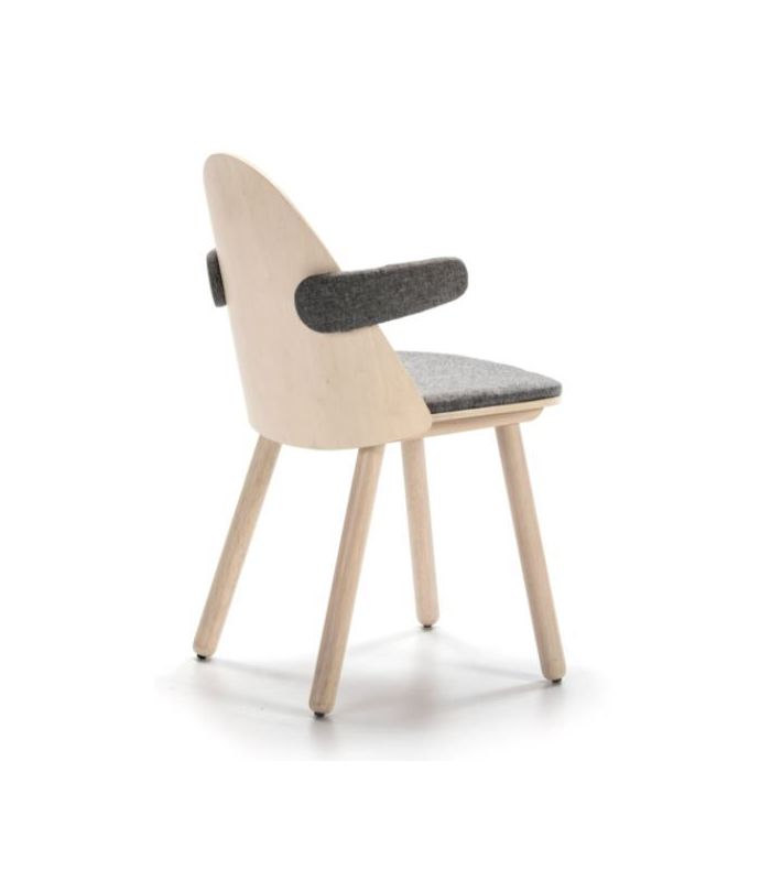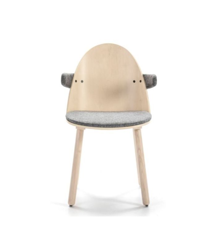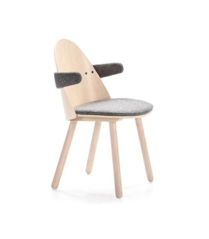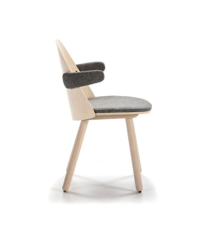 Silla de comedor Uma, está fabricada en madera con acabado en color natural claro y consta de cojín y brazos tapizados en tela. Destaca por la sutil combinación de líneas curvas y rectas y la búsqueda de sencillez y ligereza visual sin renunciar a la confortabilidad.  Está disponible en varios colores.