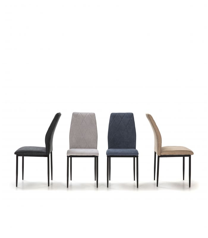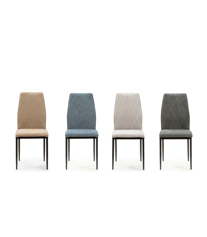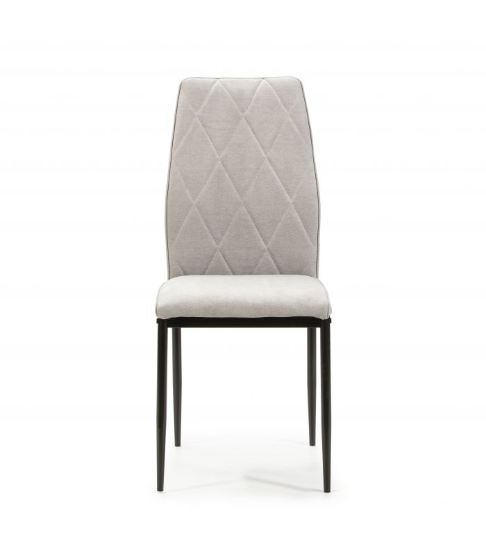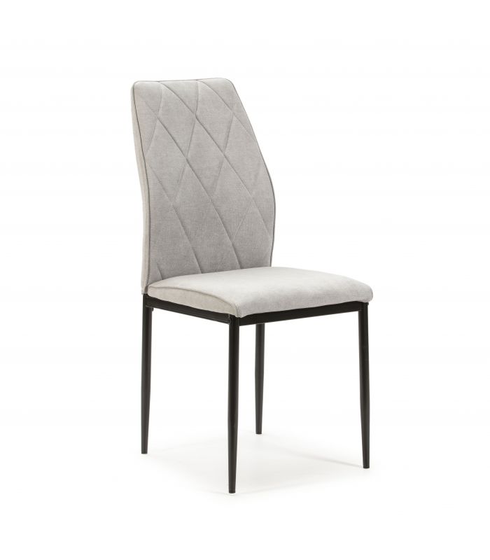 La Silla Atenas, tapizada en tejido de alta calidad, con tacto suave en color gris claro, rematado con ribete. Asiento y respaldo con alto grado de confort, el respaldo cuenta con costuras en forma de rombo, para darle un toque diferente y actual. Aportará a la estancia elegancia y sofisticación, sus patas son metálicas en color negro. Combinable con gran variedad de mesas de nuestro catálogo.