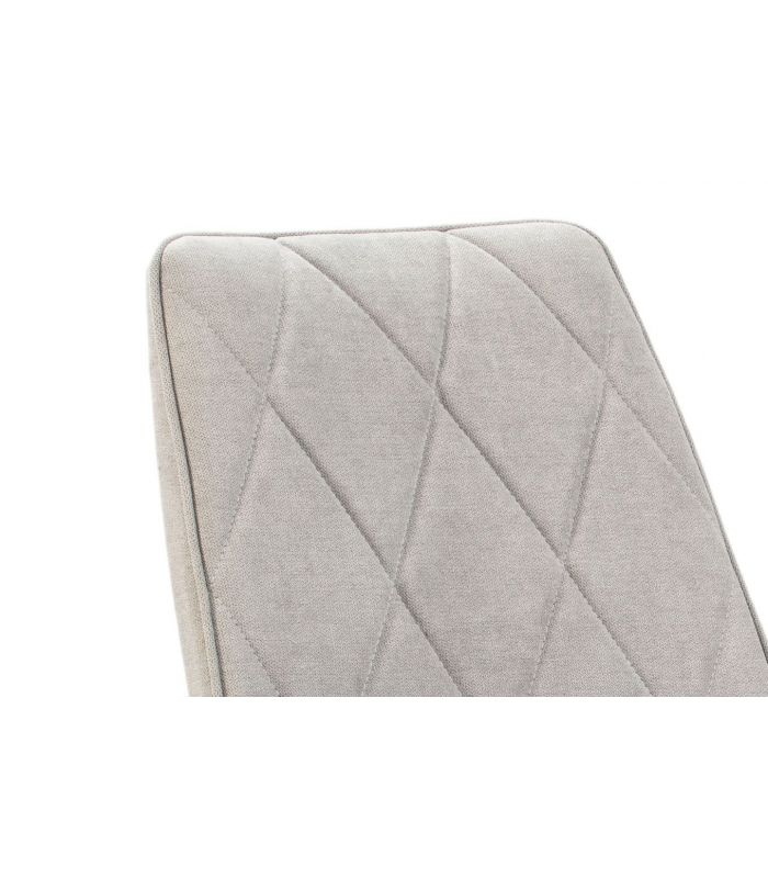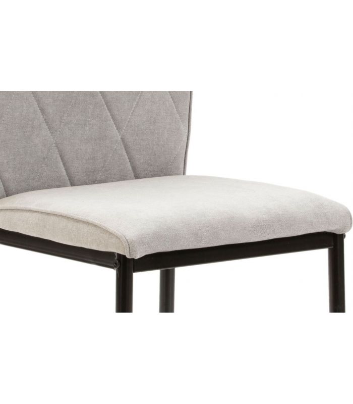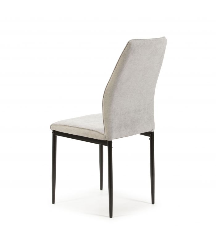 Atenas cuenta con un alto grado de confort, ya que tanto el asiento como el respaldo están acolchados, tapizados en tejido con tacto suave en color gris claro. Los laterales están rematados con ribete, para darle mayor durabilidad. En el respaldo tiene costuras haciendo rombos, para darle un toque diferente, aportando originalidad. El respaldo tiene forma curva para que la espalda se adapte mejor. Las patas están fabricadas en metal, acabado negro. También disponible en otros tejidos de diferente color en nuestra web.