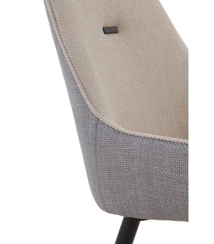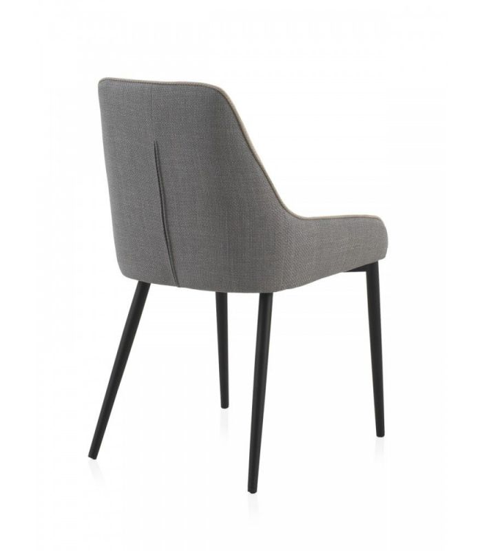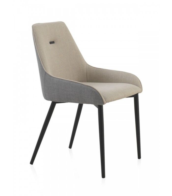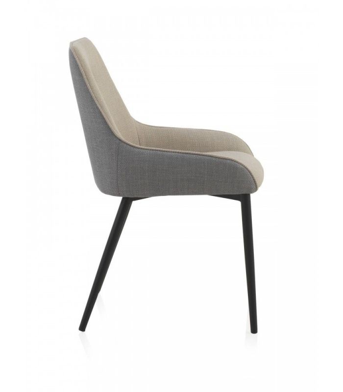 Silla de comedor  tapizada mediante una combinación original de tonos en gris y beig, con las patas acabado metálico negro.  Apuesta por un formato singular para generar un espacio diferente.