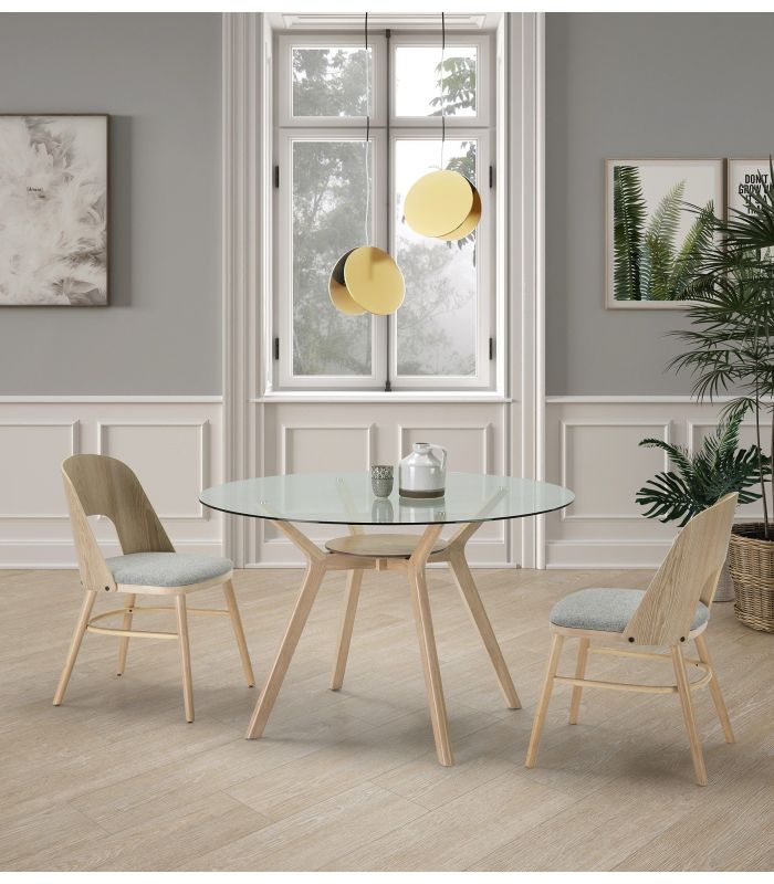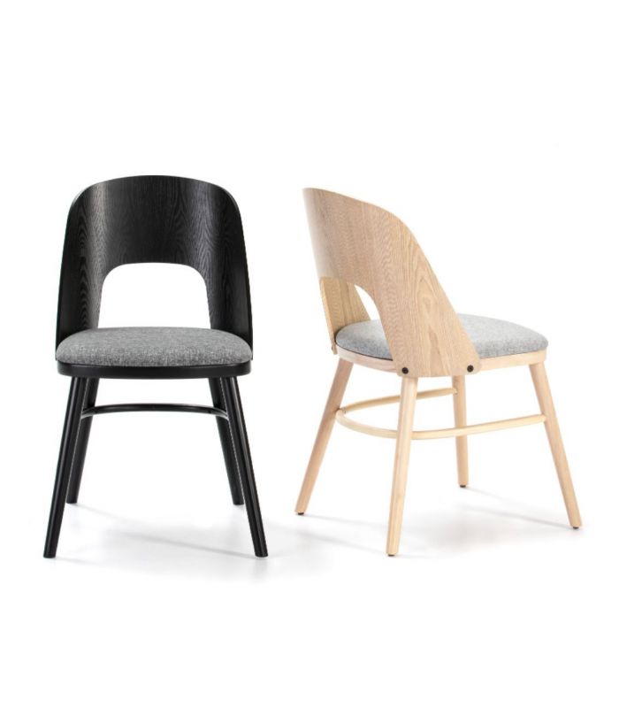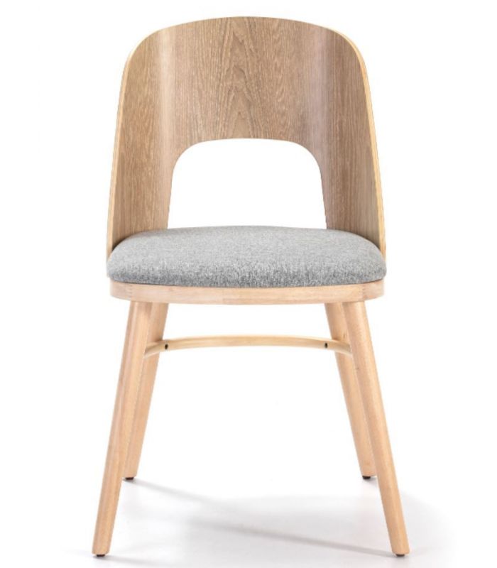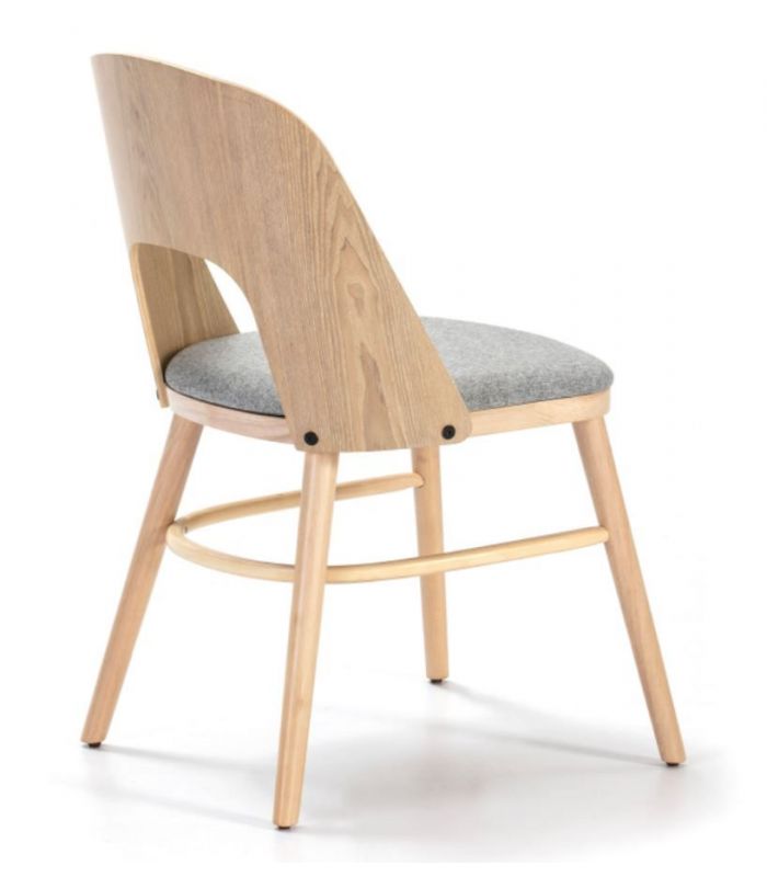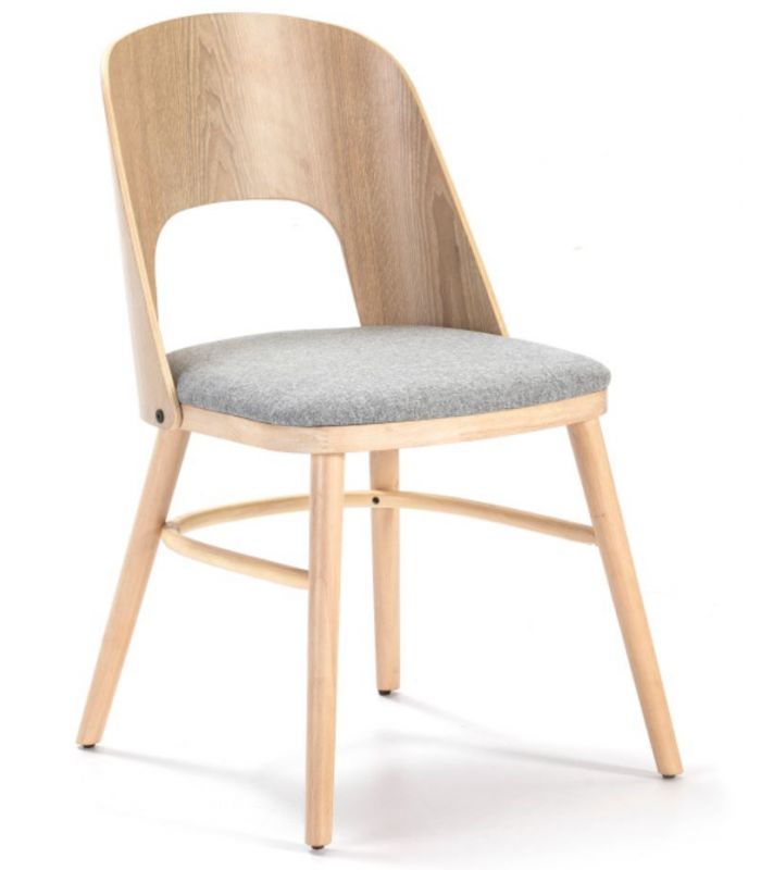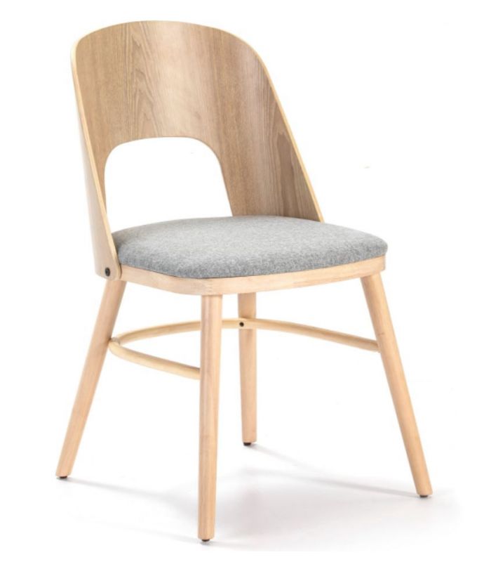 La Silla Bruxelles tiene un diseño elegante y sofisticado, fabricada en contrachapa de fresno y estructura en DM en acabado madera natural. El asiento está acolchado para hacer la sentada más agradable, tapizado en tejido gris jaspeado. El respaldo en forma redondeada aporta comodidad, con hueco central para darle un toque diferente. Combinable con gran variedad de mesas de nuestro catálogo.