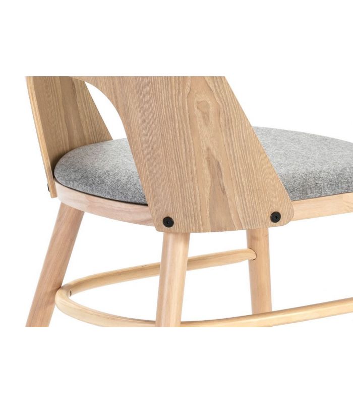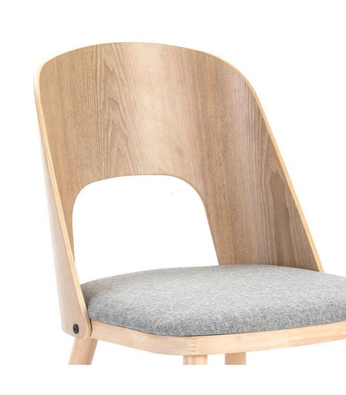 Bruxelles cuenta con un alto grado de confort, ya que el asiento está acolchado, tapizado en tejido gris jaspeado con tacto suave. El respaldo cuenta con un diseño elegante, ya que tiene forma redondeada para acoger la zona de la espalda, fabricado en contrachapado de fresno. La estructura inferior está fabricada en DM acabado madera natural, con travesaño para reforzar las patas. También disponible en madera natural en nuestra web.