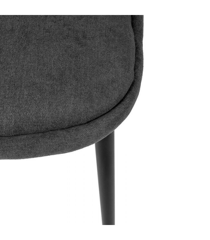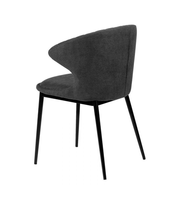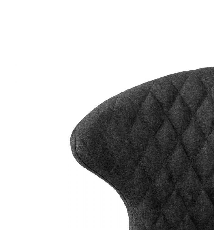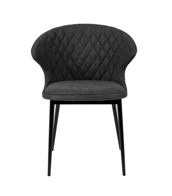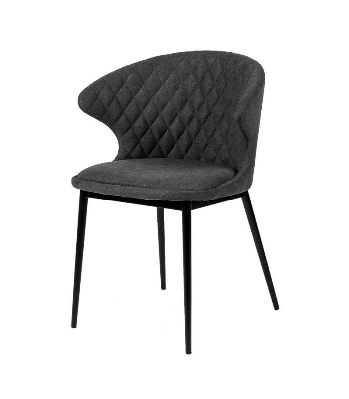 Silla Clara, compuesta por asiento tapizado con tejido en color gris oscuro, consta de costuras con forma de rombo en la parte del respaldo y estructura de metal que le aporta una gran resistencia, con acabado en color negro. Clara, marcará un antes y un despues en tu estancia, gracias al original diseño curvo que tiene en el respaldo. Disponible en varios colores.