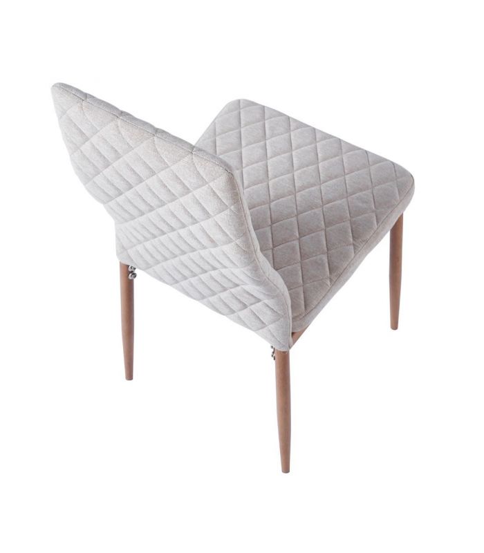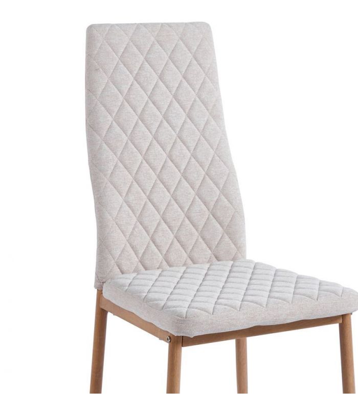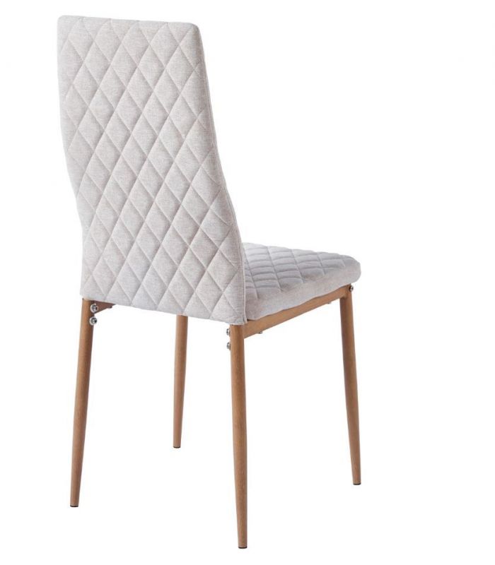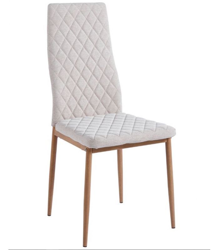 Silla Comedor Anita, fabricada con asiento y respaldo tapizado en tejido beige, con costuras decorativas y patas metálicas con acabado imitación madera roble. Ideal para combinar en cualquier estancia de comedor gracias a su diseño sencillo y moderno. Disponible en varios colores.