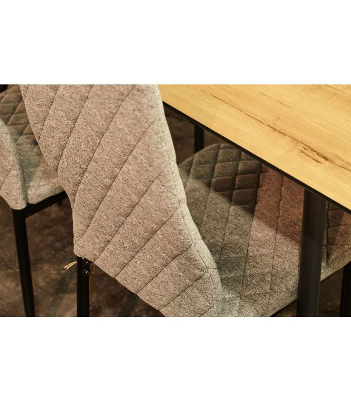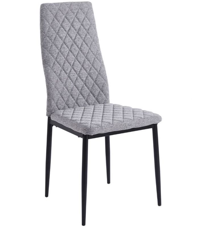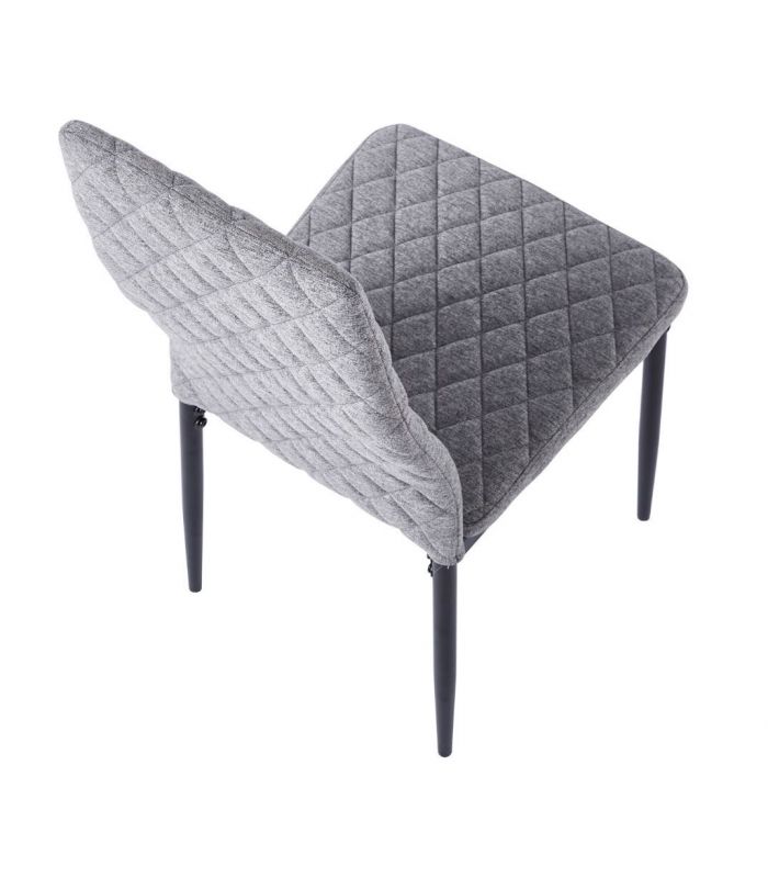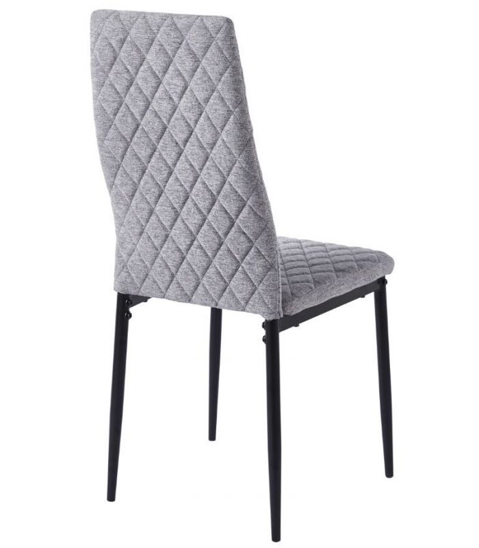 Silla Comedor Anita, fabricada con asiento y respaldo tapizado en tejido gris, con costuras decorativas y patas metálicas con acabado negro. Ideal para combinar en cualquier estancia de comedor gracias a su diseño sencillo y moderno. Disponible en varios colores.