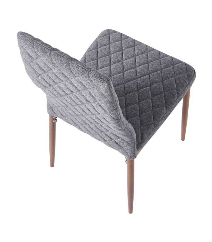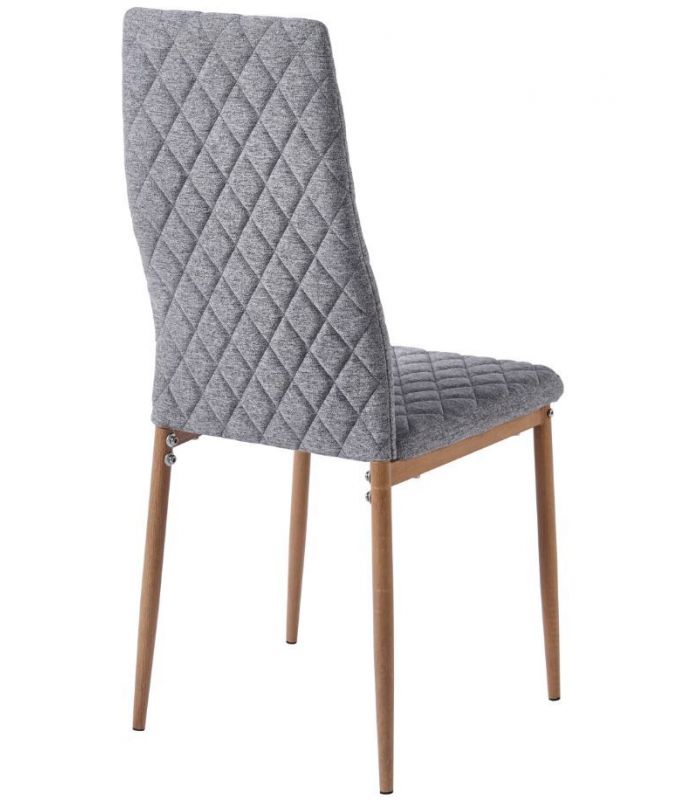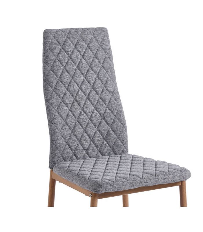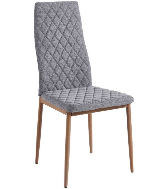 Silla Comedor Anita, fabricada con asiento y respaldo tapizado en tejido gris, con costuras decorativas y patas metálicas con acabado imitación madera roble. Ideal para combinar en cualquier estancia de comedor gracias a su diseño sencillo y moderno. Disponible en varios colores.