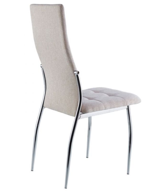 La silla de comedor Diana, es una magnífica silla fabricada con materiales de primera calidad lo que hace que sea resistente y estable. Esta compuesta por asiento y respaldo acolchados que aportan gran comodidad, tapizada en tejido beige y patas metálicas con acabado cromado, que destacan por su diseño curvado.