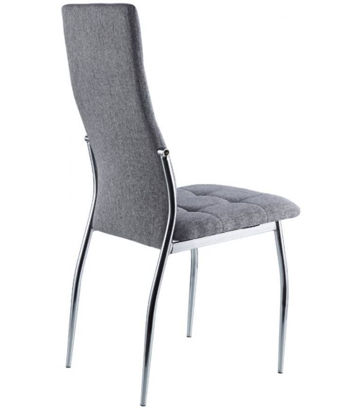 La silla de comedor Diana, es una magnífica silla fabricada con materiales de primera calidad lo que hace que sea resistente y estable. Esta compuesta por asiento y respaldo acolchados que aportan gran comodidad, tapizada en tejido gris y patas metálicas con acabado cromado, que destacan por su diseño curvado.