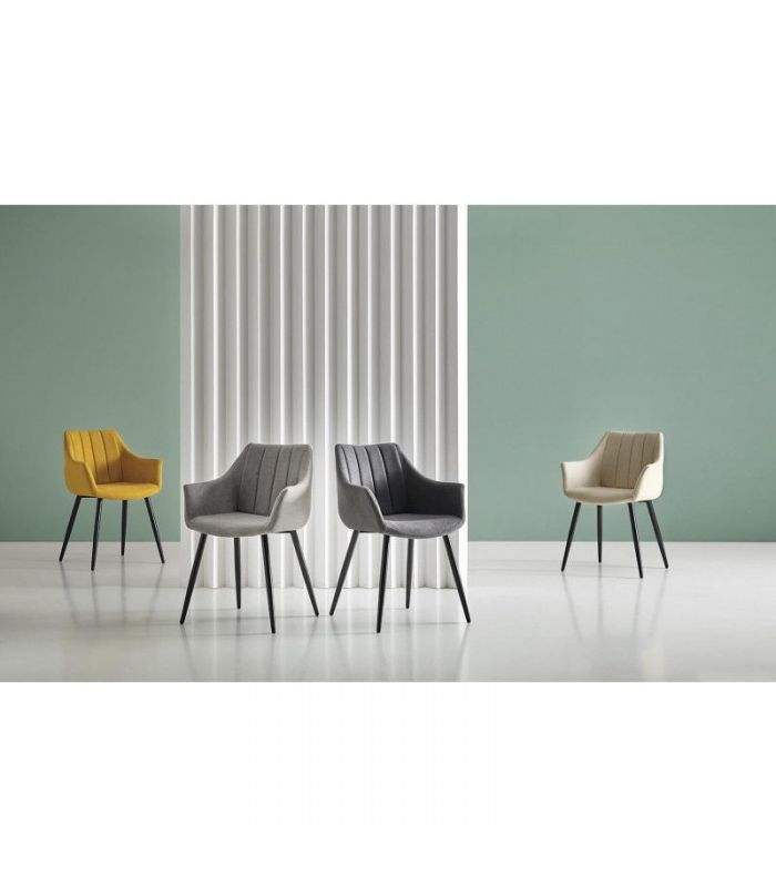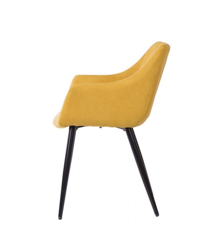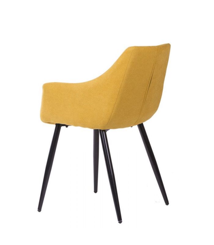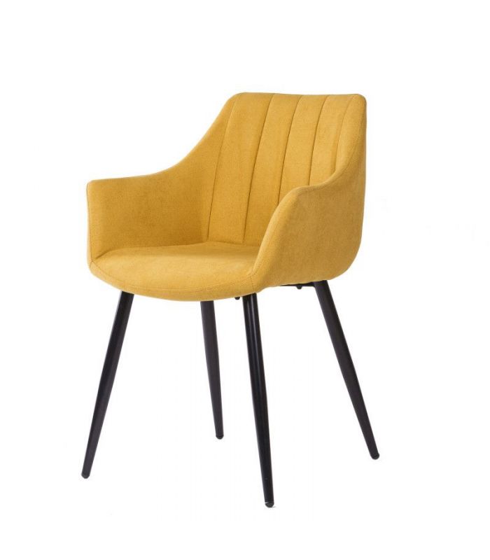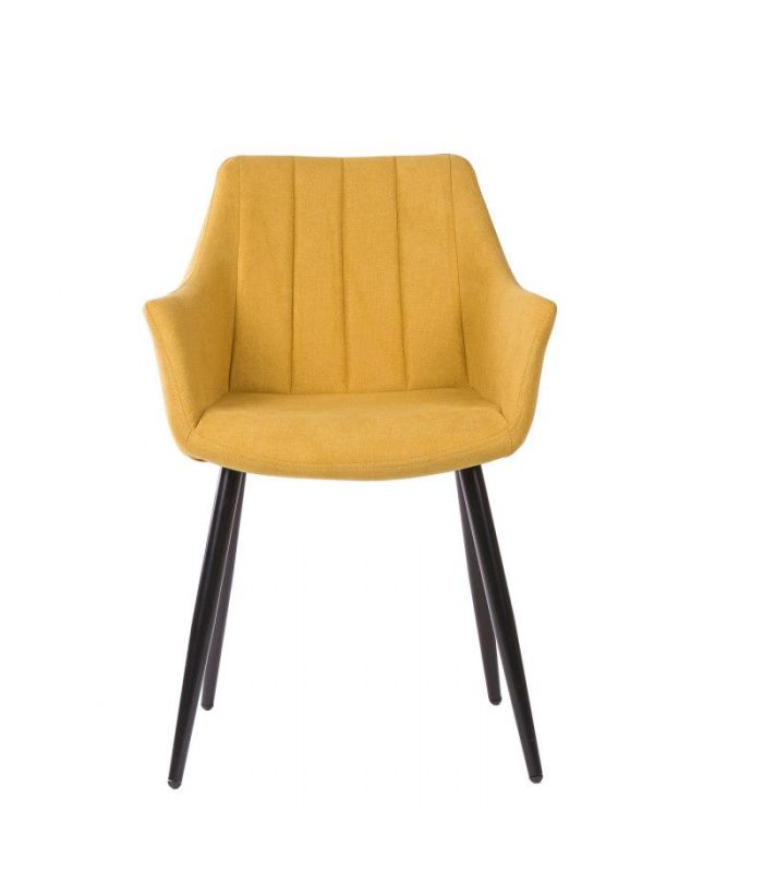 Silla con Brazos Fiona, compuesta por asiento tapizado en color mostaza, con costuras verticales y patas cónicas de metal, de gran resistencia, color negro. Los brazos le aportan un sensación de sillón muy cómodo. La versatilidad de esta silla tapizada permite utilizarla tanto en comedores, como zonas comunes. Disponible en varios colores.