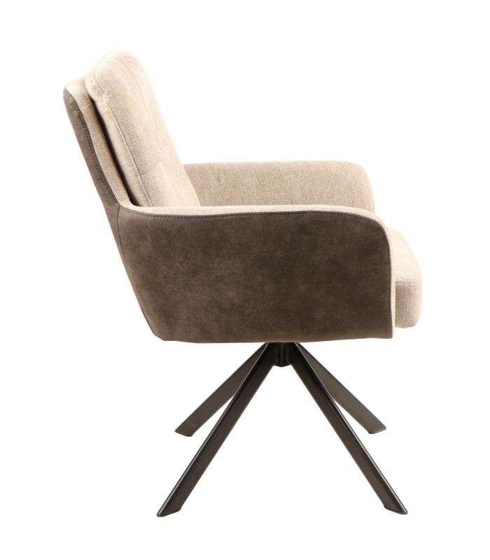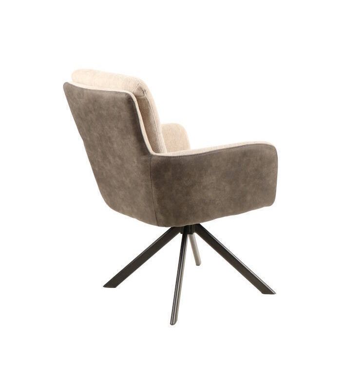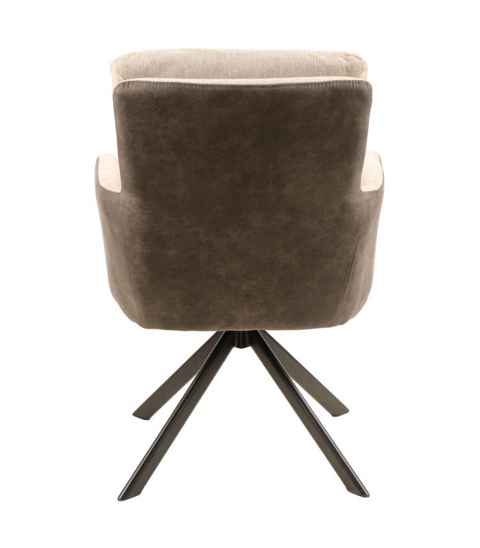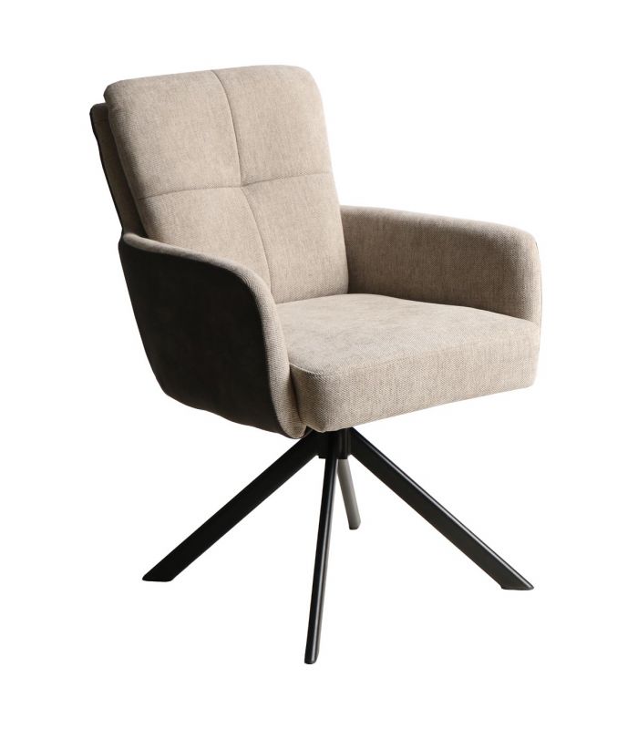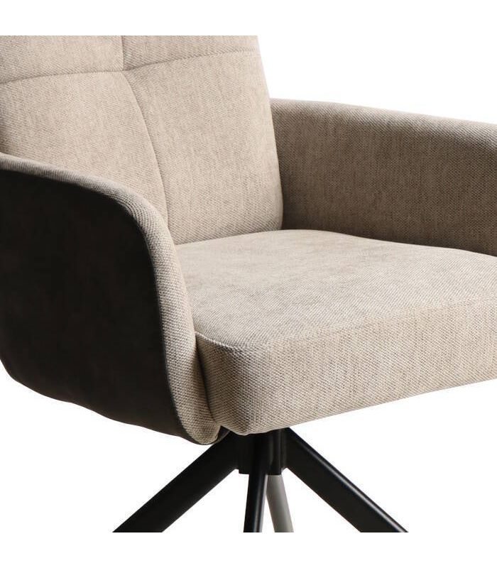Silla de comedor Sol, fabricada con materiales de alta calidad. Tapizada en tejido jaspeado color Beige, combinando la zona posterior en tejido tipo napa color marrón oscuro. Sus patas son giratorias en metal negroDisponible en otros acabados en nuestra web. Ideal para comedores y salones de estilo moderno. Se vende en pack de 4 unidades.