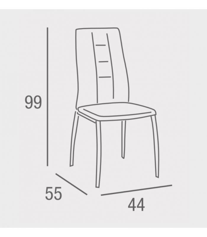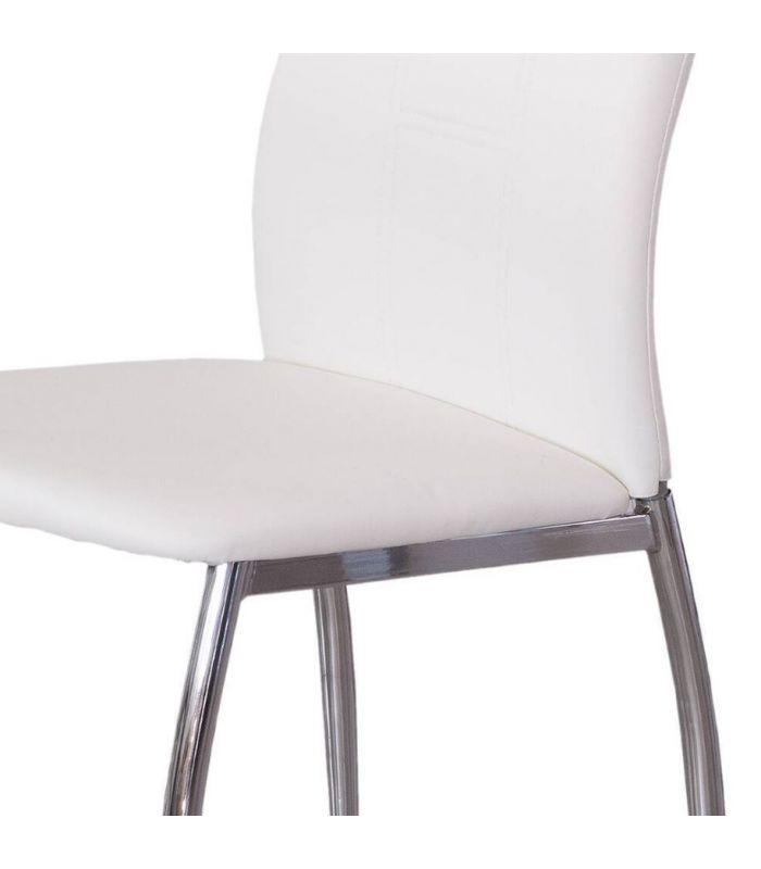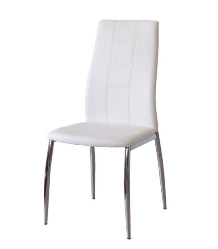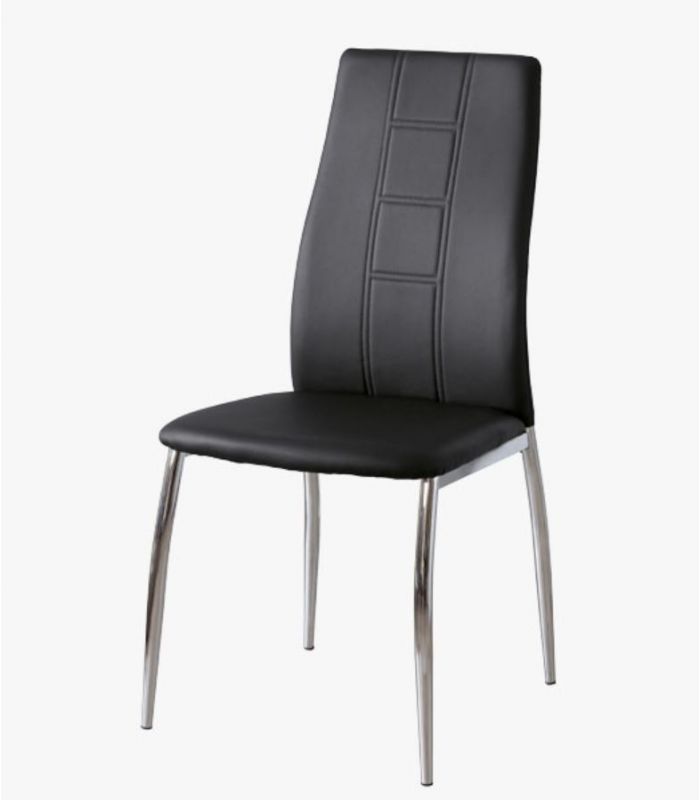 Silla de comedor Roxy, tapizada en ecopiel con patas metálicas cromadas. El respaldo tiene adorno geométrico pespunteado en el asiento con hilo al tono. Disponible en varios acabados y varios tejidos en nuestra web. Ideal para comedores y salones de estilo moderno. Se vende en pack de 6 unidades.