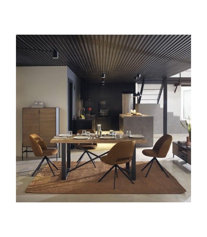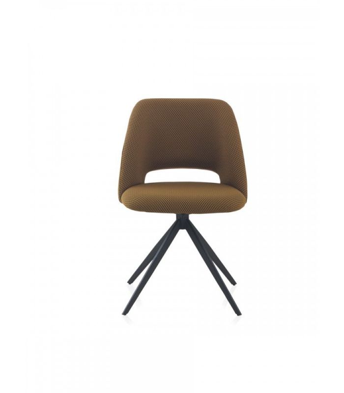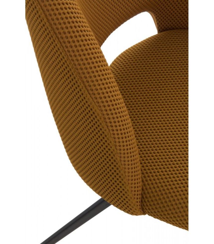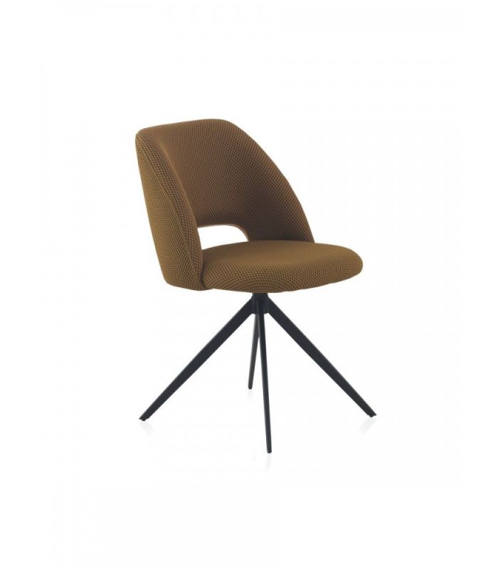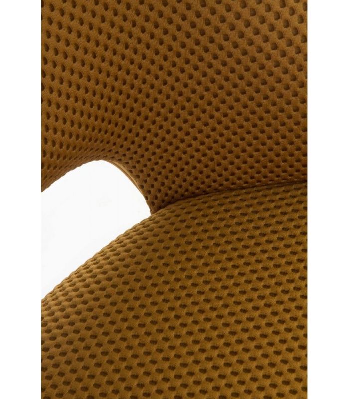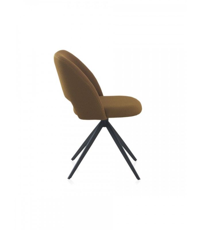 Silla de comedor  tapizada en tejido nido abeja con acabado color mostaza, el acabado de las patas es metálico negro.  La peculiaridad de este formato reside en ser giratoria, dotando de una gran funcionalidad a esta silla. También disponible en textil blanco.