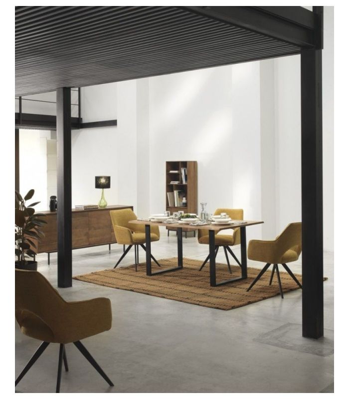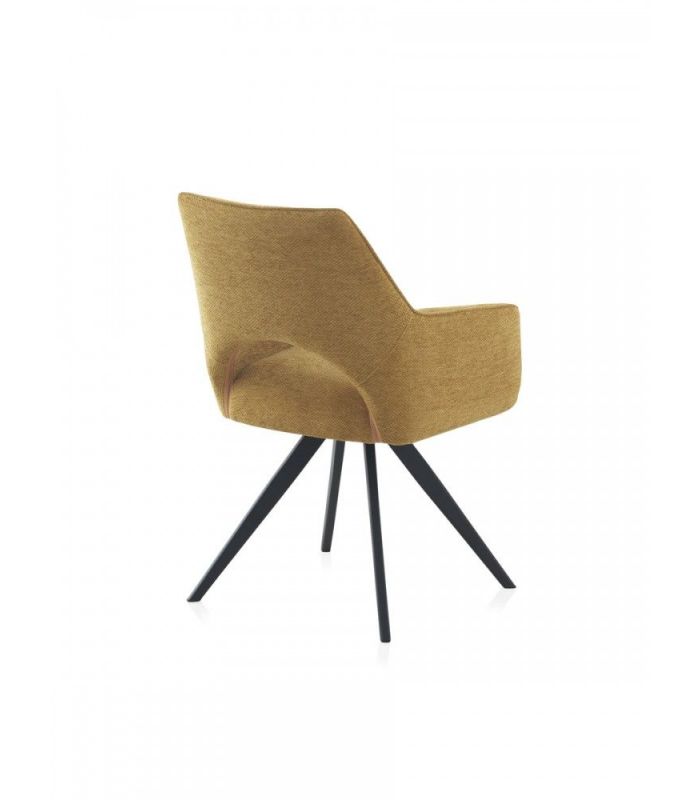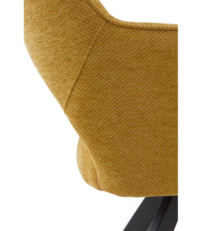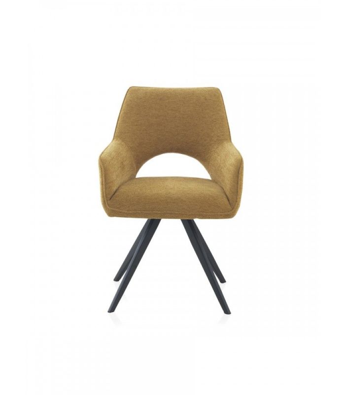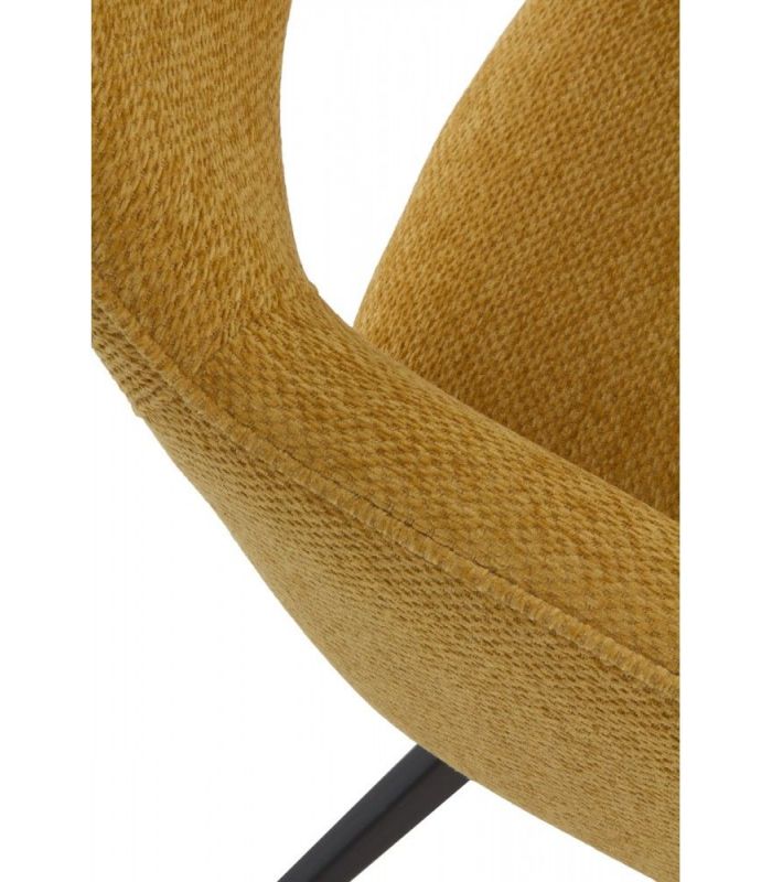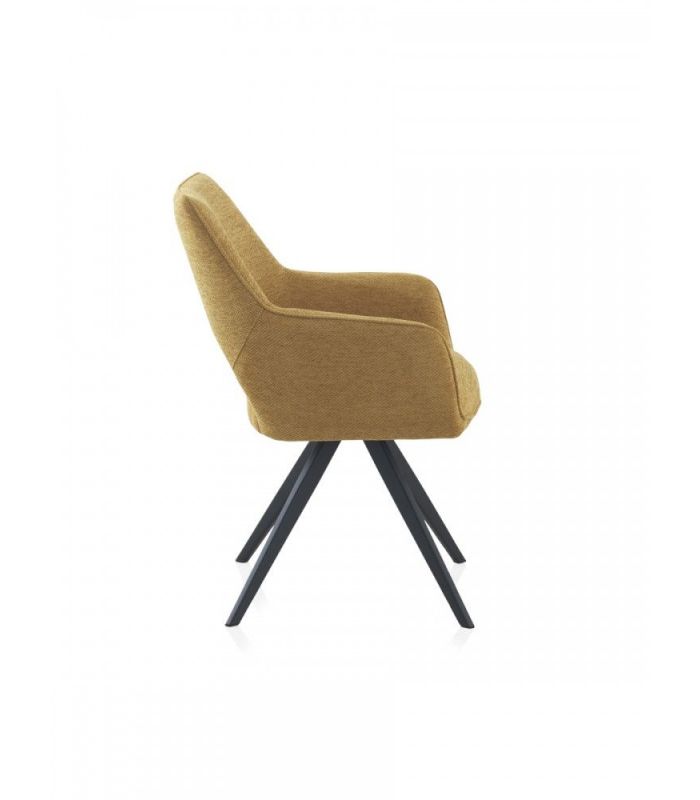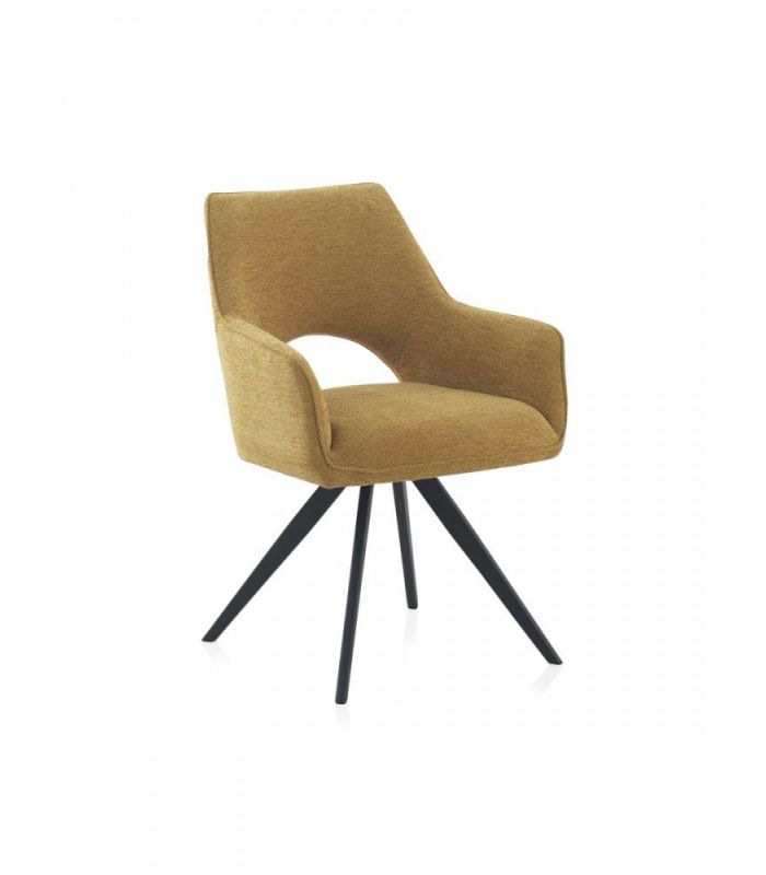 Sillón de comedor  tapizado en tejido color mostaza, el acabado de las patas es metálico negro.  La peculiaridad de este formato reside en ser giratorio, dotando de una gran funcionalidad a este sillón.