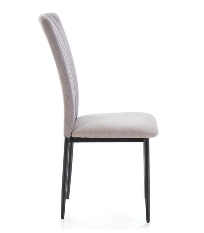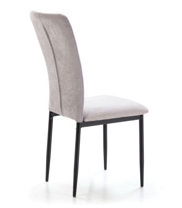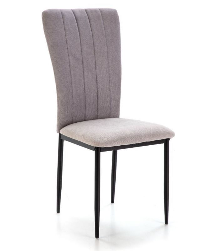 Silla Holly, tapizada en tejido de alta calidad, con tacto suave en color gris claro. Asiento y respaldo con alto grado de confort, el respaldo cuenta con costuras en lineales. Aportará a la estancia elegancia y sofisticación, sus patas son metálicas en color negro. Combinable con gran variedad de mesas de nuestro catálogo.