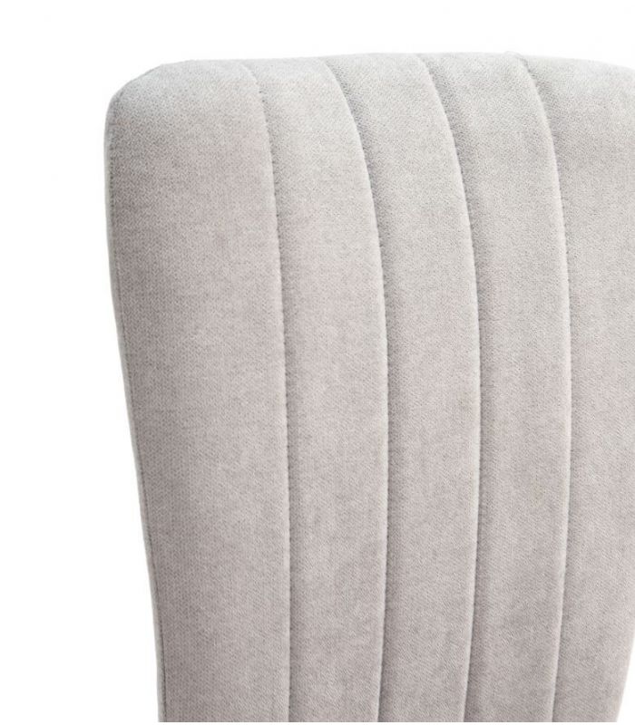 Holly cuenta con un alto grado de confort, ya que tanto el asiento como el respaldo están acolchados, tapizada en tejido con tacto suave color gris claro. El respaldo tiene costuras lineales para darle un toque diferente, aportando originalidad. Además, la forma del respaldo en la parte superior es más grande, para que la espalda se adapte mejor. Las patas están fabricadas en metal, acabado negro. Disponible en otros tejidos de diferente color en nuestra web.
