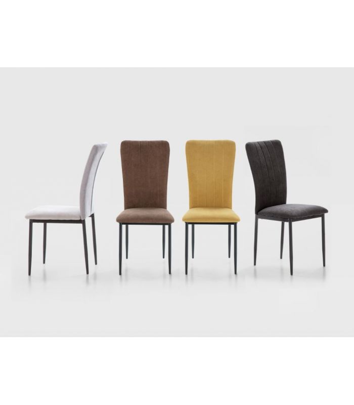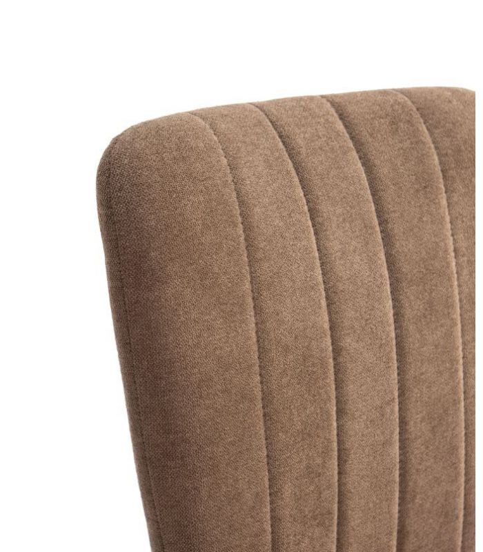 Holly cuenta con un alto grado de confort, ya que tanto el asiento como el respaldo están acolchados, tapizada en tejido con tacto suave color marrón. El respaldo tiene costuras lineales para darle un toque diferente, aportando originalidad. Además, la forma del respaldo en la parte superior es más grande, para que la espalda se adapte mejor. Las patas están fabricadas en metal, acabado negro. Disponible en otros tejidos de diferente color en nuestra web.