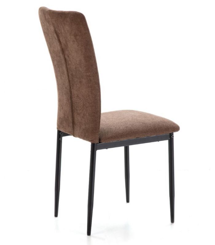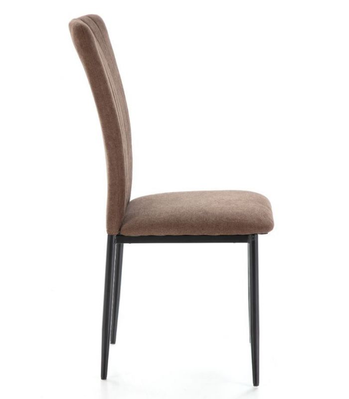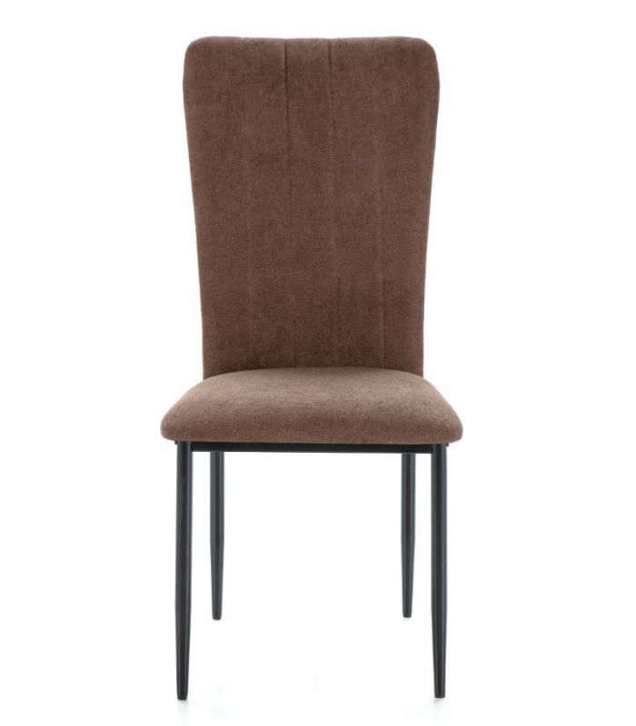 La Silla Holly está tapizada en tejido de alta calidad, con tacto suave en color marrón. Asiento y respaldo con alto grado de confort, el respaldo cuenta con costuras en lineales. Aportará a la estancia elegancia y sofisticación, sus patas son metálicas en color negro. Combinable con gran variedad de mesas de nuestro catálogo.