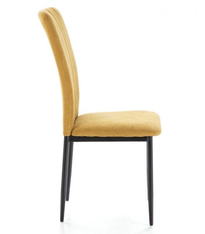 La Silla Holly está tapizada en tejido de alta calidad, con tacto suave en color mostaza. Asiento y respaldo con alto grado de confort, el respaldo cuenta con costuras en lineales. Aportará a la estancia elegancia y sofisticación, sus patas son metálicas en color negro. Combinable con gran variedad de mesas de nuestro catálogo.