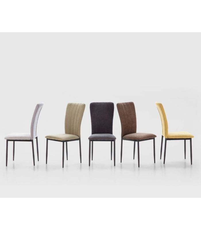 Holly cuenta con un alto grado de confort, ya que tanto el asiento como el respaldo están acolchados, tapizada en tejido con tacto suave color mostaza. El respaldo tiene costuras lineales para darle un toque diferente, aportando originalidad. Además, la forma del respaldo en la parte superior es más grande, para que la espalda se adapte mejor. Las patas están fabricadas en metal, acabado negro. Disponible en otros tejidos de diferente color en nuestra web.