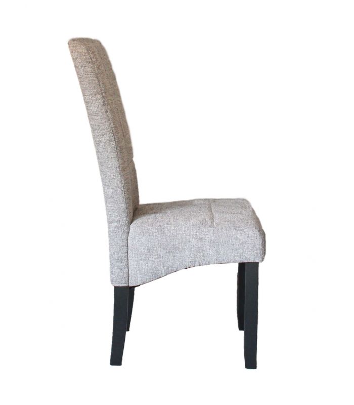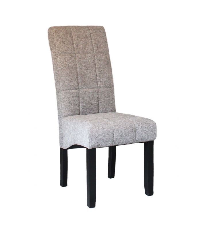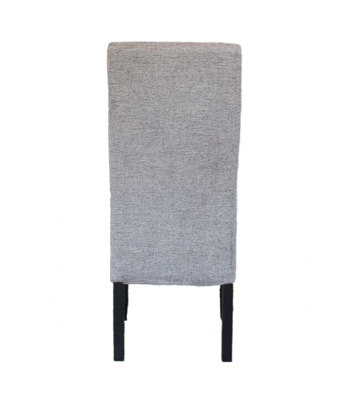 Kali es una silla con un diseño sencillo de líneas rectas, tapizada en tejido color gris, con respaldo tipo capitoné. Está fabricada en contrachapado de madera con relleno de espuma. Sus patas son de madera color negro, y en la parte inferior tiene conteras antirallado para no dañar el pavimento. Ideal para utilizar en salón, comedor, hostelería... De uso diario gracias a los materiales con los que está fabricada. Sus patas son fuertes y robustas.
