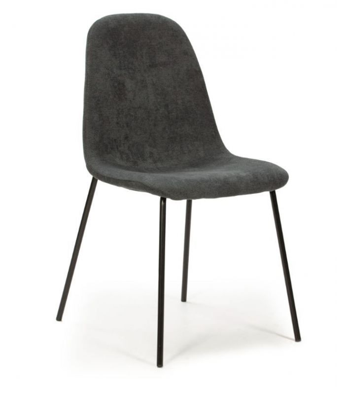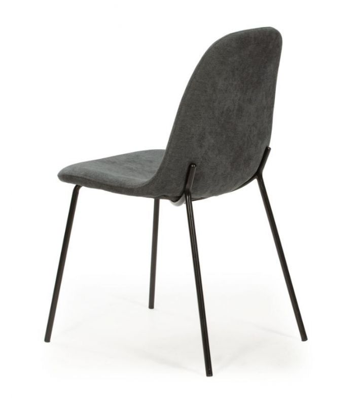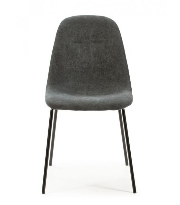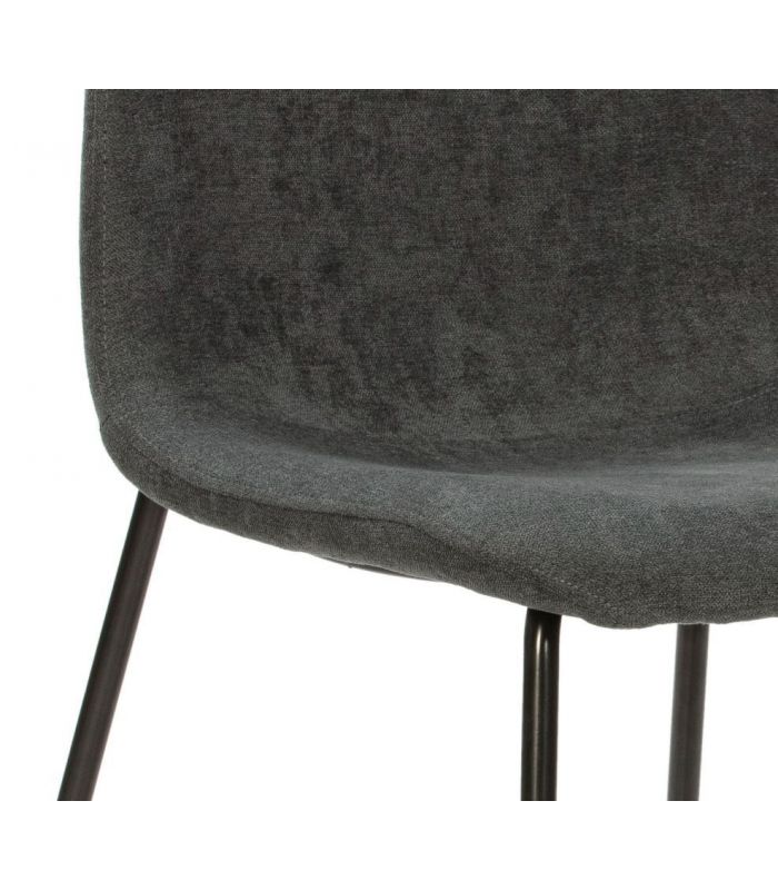 Renne cuenta con un alto grado de confort, ya que tanto el asiento como el respaldo están acolchados, tapizada en tejido con tacto suave color gris oscuro. El diseño es diferente, con costura fuerte aportando originalidad. Las patas están fabricadas en metal, acabado negro. Disponible en otros tejidos de diferente color en nuestra web.