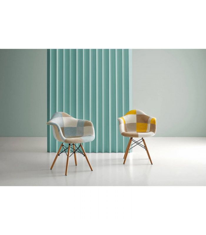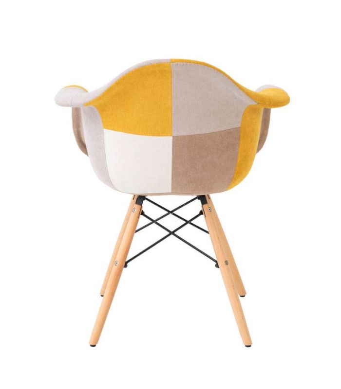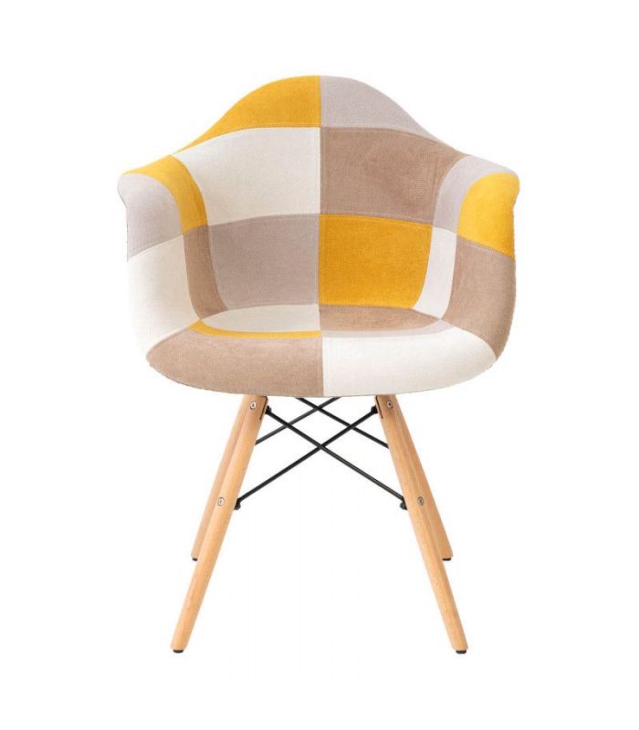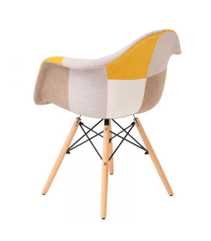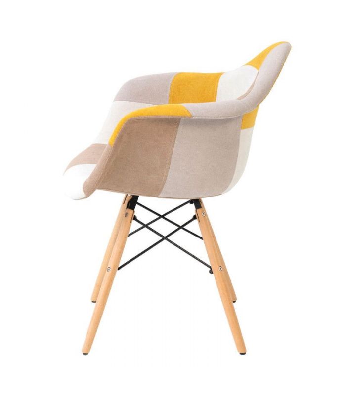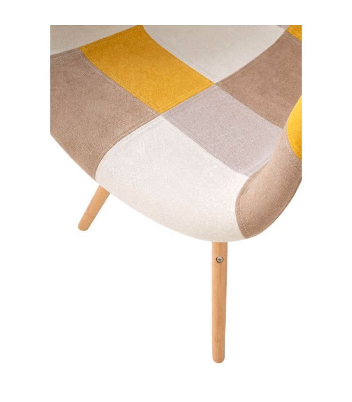 Silla Sofie, con asiento tapizado en patchwork, predominando el color mostaza y patas de madera de haya con varilla metálica de refuerzo. La Silla Sofie es perfecta para personas originales y creativas, ya que se compone de un diseño muy peculiar. Encaja en ambientes de comedor, o para utilizar como sillón auxiliar. Le dará un toque de color a la estancia donde se coloque.