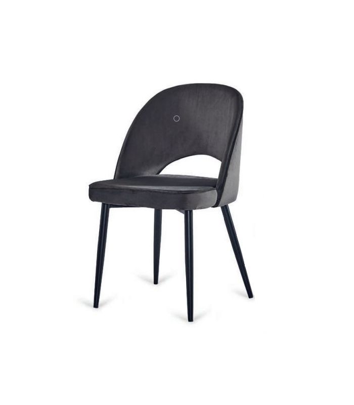 Silla Teruel, compuesta por asiento y respaldo tapizado en terciopelo en color gris oscuro y patas metálicas con acabado en color negro. Se trata de una silla que se puede utilizar en gran variedad de estancias.  Pack de 2 unidades.