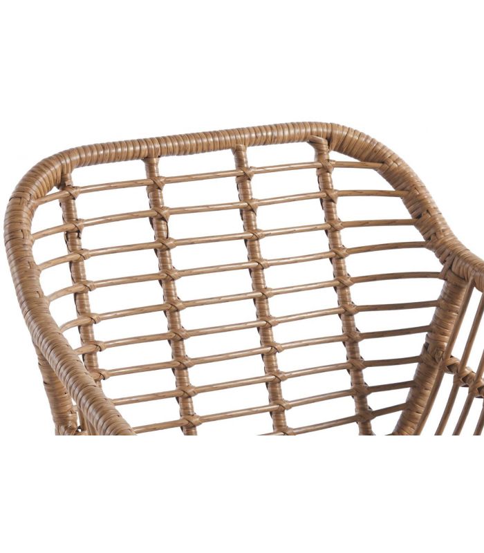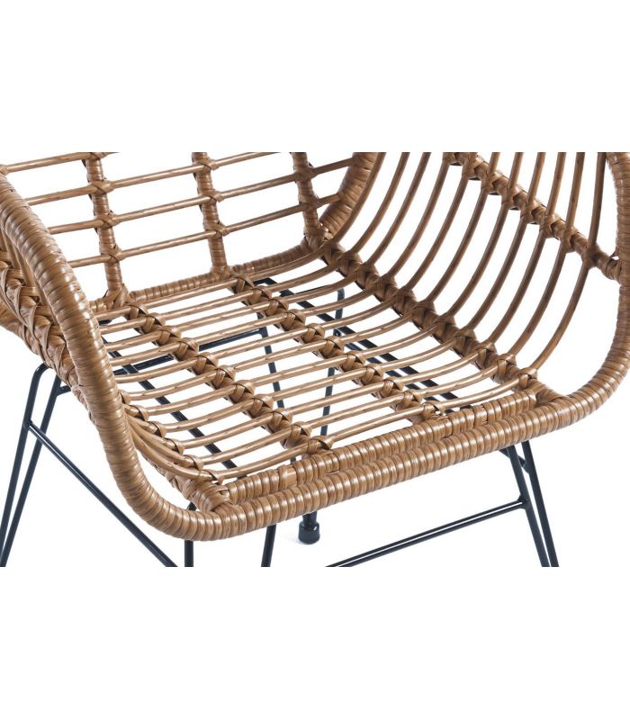Su estructura está fabricada en metal, un material altamente resistente y duradero, en acabado negro mate. El asiento está fabricado en ratán sintético, color natural, con tratamiento anti UV. Su estructura viene reforzada con unas varillas metálicas internas, que le otorgan estabilidad y dispone de tacos antideslizantes y antirayaduras por lo que podrás utilizarlo en cualquier tipo de suelo.