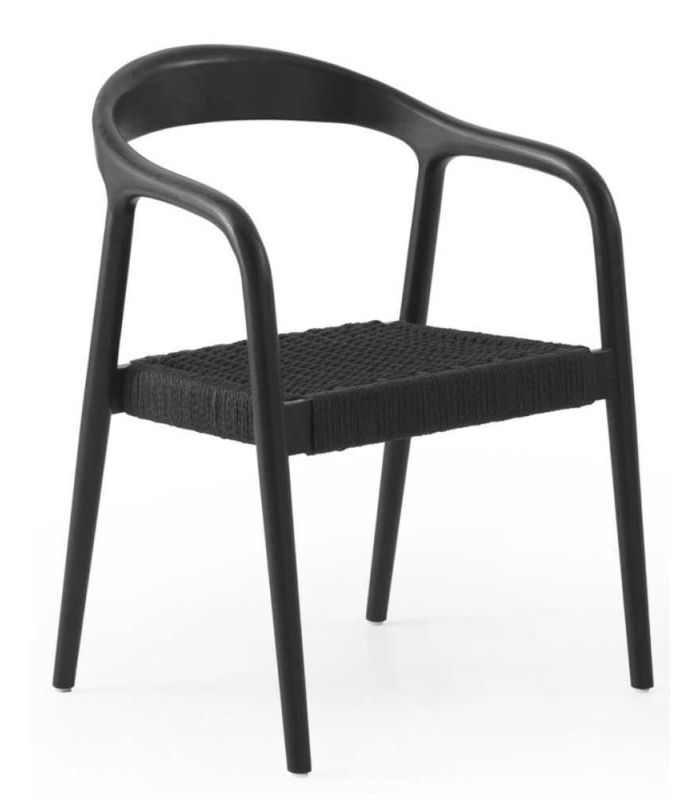 Sillón de diseño con estructura de madera de fresno, color Negro. Su detalle de trenzado en el asiento le aporta un toque de lo más original, fabricado en cuerda natural Apuesta por un formato original, evocador y decorativo con este precioso sillón de comedor.