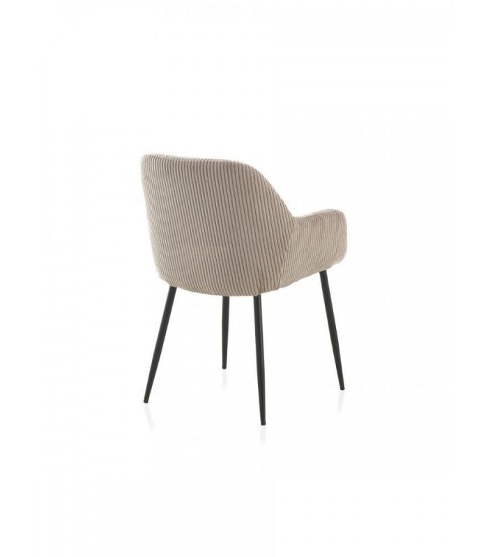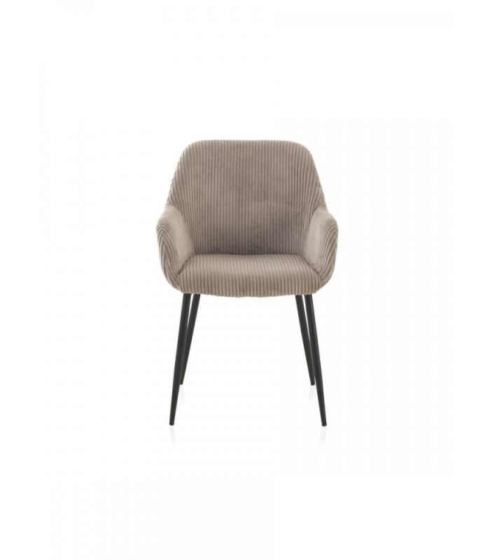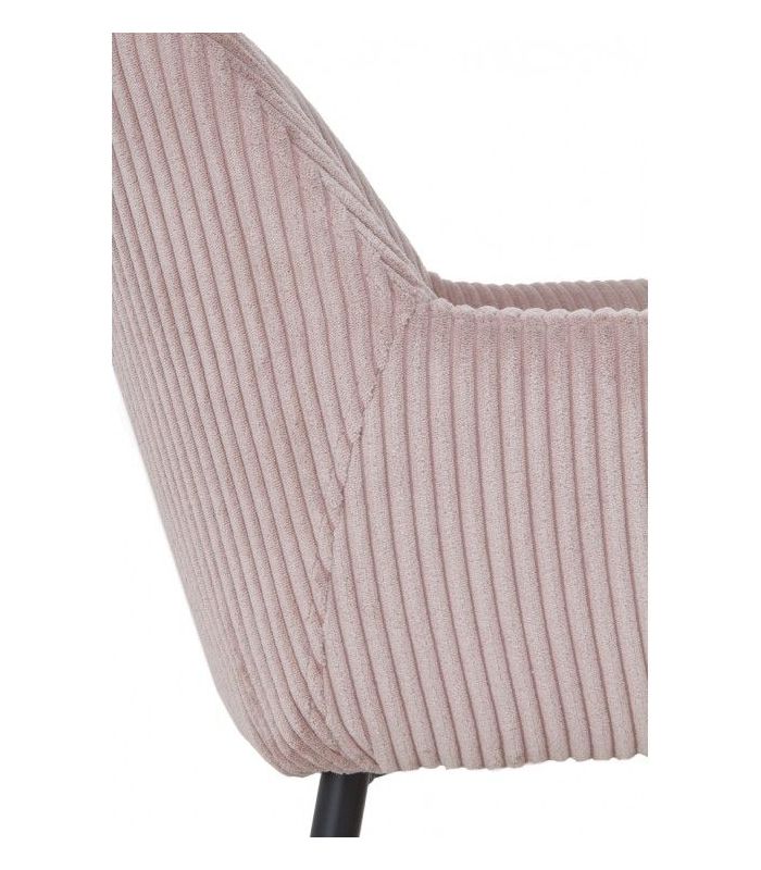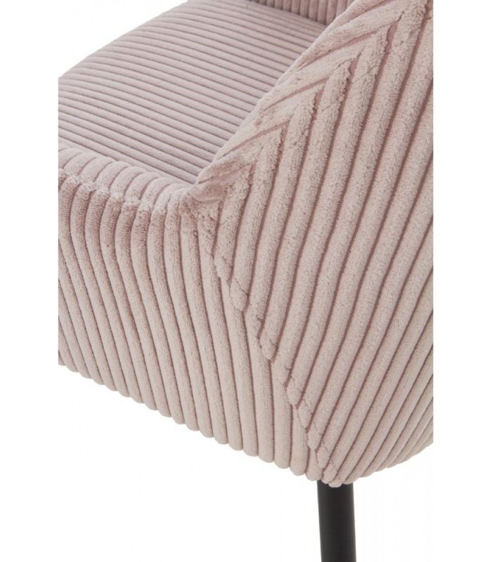 Sillón tapizado en tejido pana lavanda, el acabado de las patas es metálico negro.  Apuesta por un