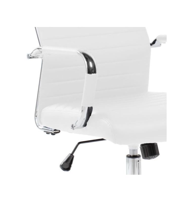 Silla de oficina Belisa, dispone de mecanismo hidráulico elevador, sistema de balanceoreposabrazos cromados con funda de ecopiel y respaldo ergonómico. Está tapizada en ecopiel blanco estructura cromada.  Disponible en color negro también.