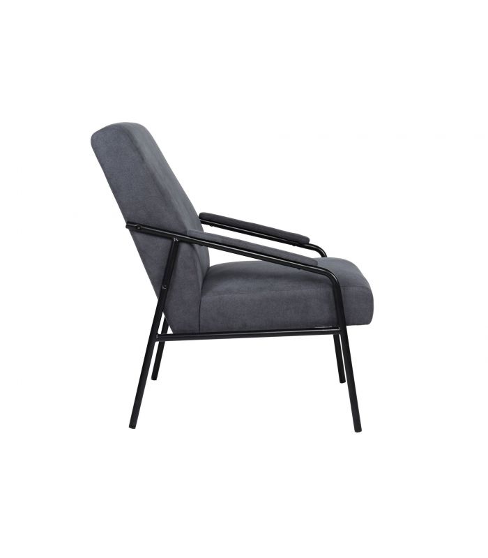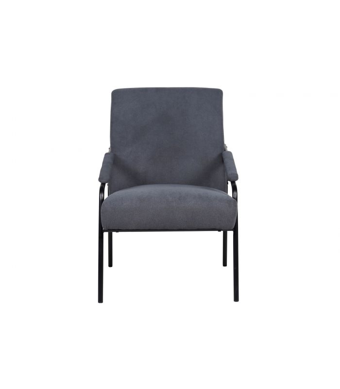 Times es una butaca con un diseño exclusivo, ya que está tapizada tejido color gris. Con terminaciones curvas y remates en los bordes para darle más resistencia y durabilidad. Es una butaca que se utiliza como asiento auxiliar, para dar un toque especial a la estancia. Sus patas son metálicas, en acabado negro, con conteras para darle estabilidad al asiento.
