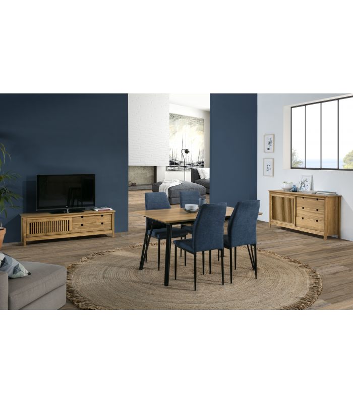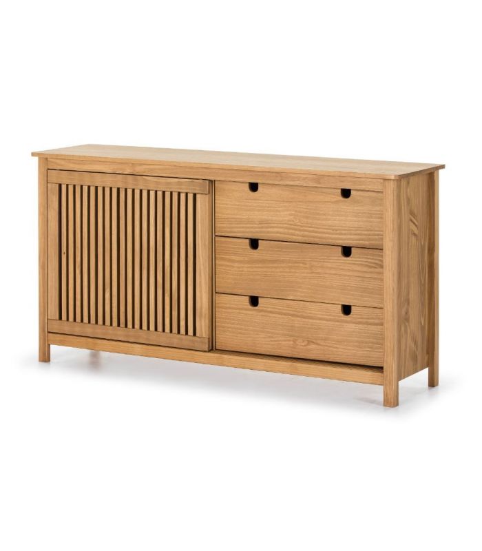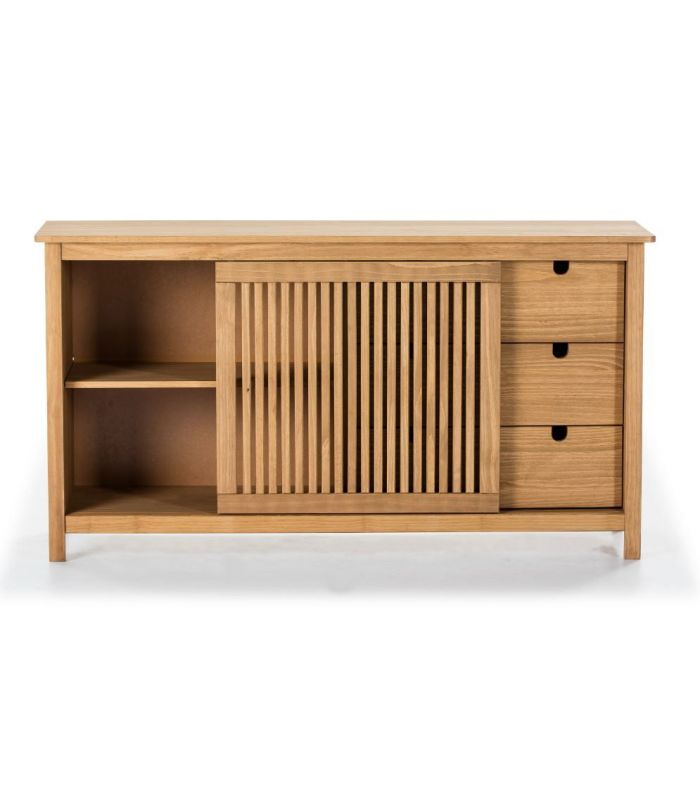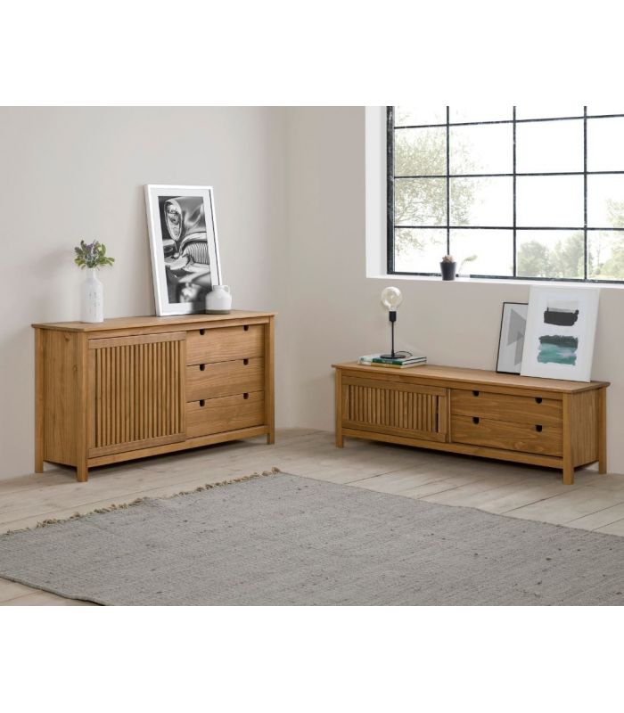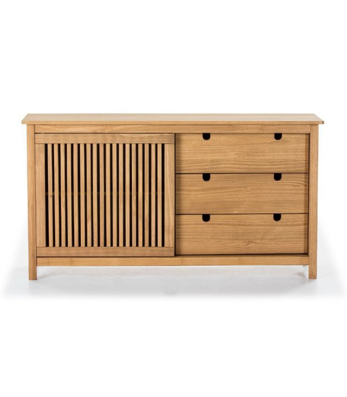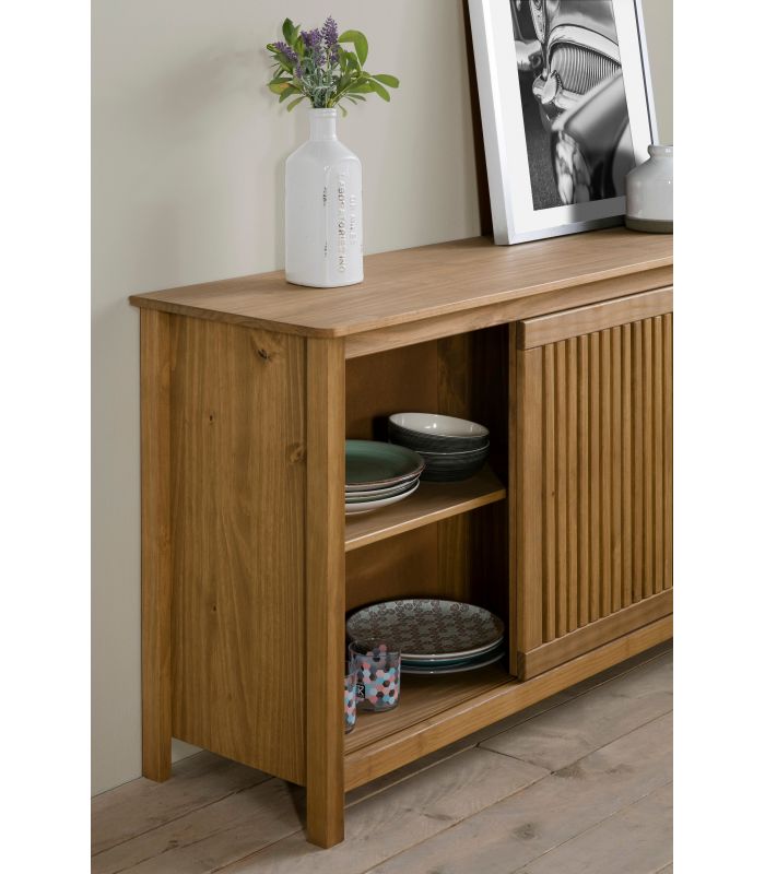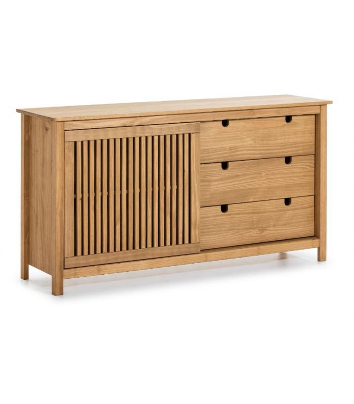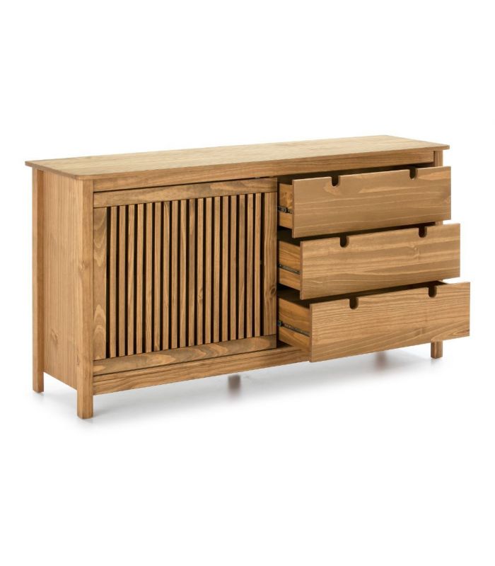 Aparador Bruna, fabricado en madera de pino acabado cera. Cuenta con un diseño especial, ya que la puerta es corredera y está fabricada con listones de madera dejando ver el interior. Su interior cuenta con un estante ideal para el almacenaje. También cuenta con 3 cajones de gran capacidad ideales para guardar multitud de objetos de uso diario.