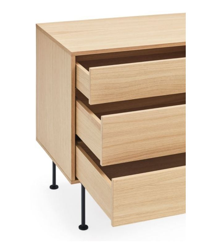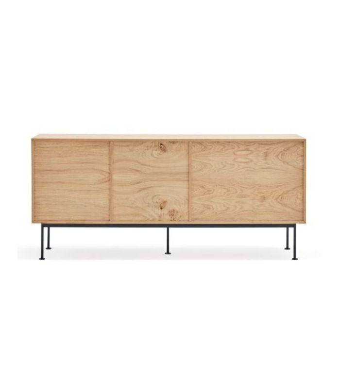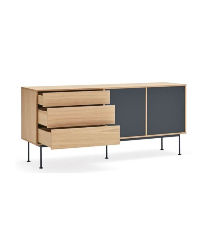 Aparador Yoko, combina la naturalidad de la madera con detalles en color, haciéndola perfecta para encajar en distintos ambientes. Está fabricado en roble con acabado natural combinado con antracita patas fabricadas en acero con acabado en color antracita. Está compuesto por tres cajones con apertura por pulsación y dos puertas batientes lacadas de apertura por pulsación.