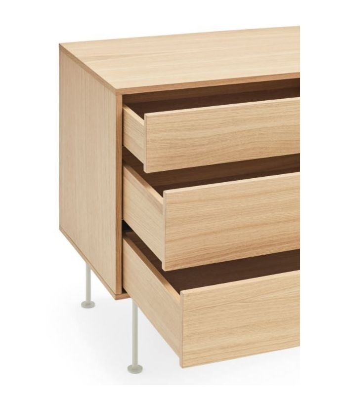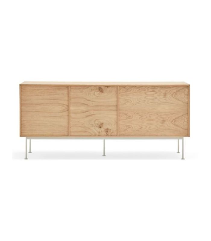 Aparador Yoko, combina la naturalidad de la madera con detalles en color, haciéndola perfecta para encajar en distintos ambientes. está fabricado en roble con acabado natural combinado con crema y patas fabricadas en acero con acabado en color crema. Está compuesto por tres cajones con apertura por pulsación y dos puertas batientes lacadas de apertura por pulsación.