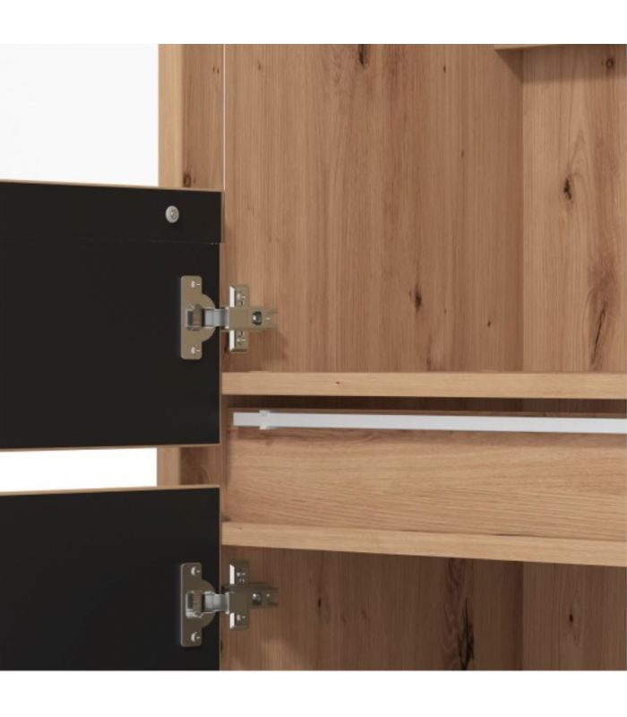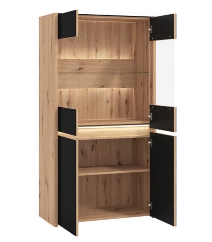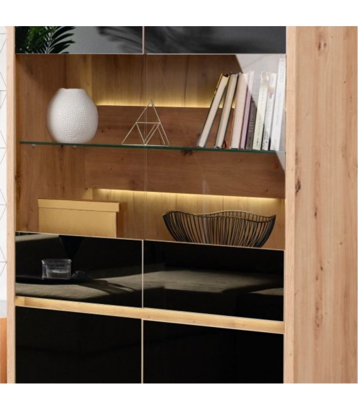 Molise es una colección que cuida cada detalle, con un resultado espectacular. La vitrina baja está fabricada en laminado sintético color roble artisan y frente en cristal negro y transparente. El interior está compuesto por estantes en roble y cristal transparente a la altura de la zona vista, con la posibilidad de incluir luces leds. Es resistente a arañazos, golpes, altas temperaturas y humedad.