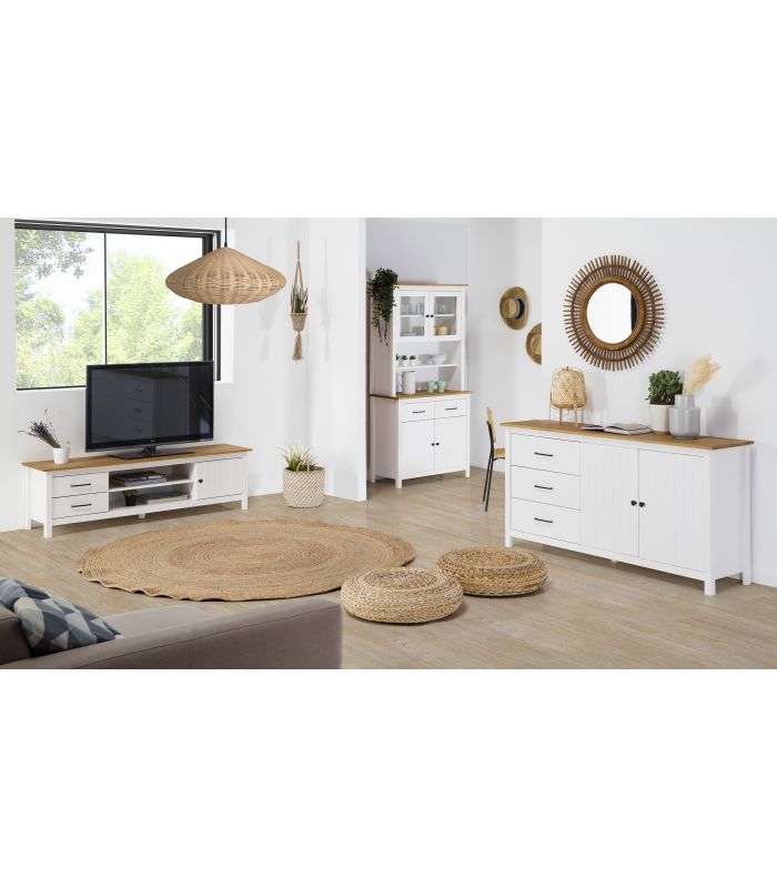 madera de pino, pintada en acabado blanco, donde se puede ver la veta de la propia madera. Ideal para combinar en ambientes rústicos y modernos, ya que sus terminaciones son elegantes, de fácil combinación.