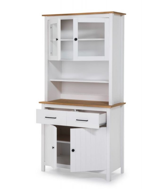puertas y cajones en la parte inferior, 2 estantes y 2 puertas superiores con cristal, ideal para utilizar de almacenaje. Está fabricada en