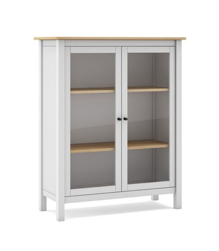 madera de pino, pintada en acabado Blanco, combinada en acabado roble. Ideal para combinar en ambientes rústicos y modernos, ya que sus terminaciones son elegantes, de fácil combinación.